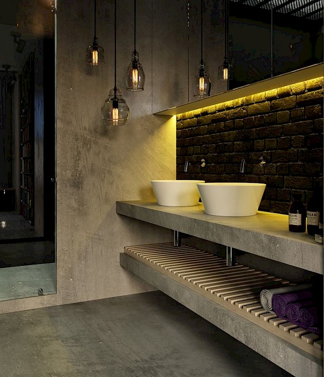 Dark bathroom interior - wooden drawers and lots of light bulbs without shades