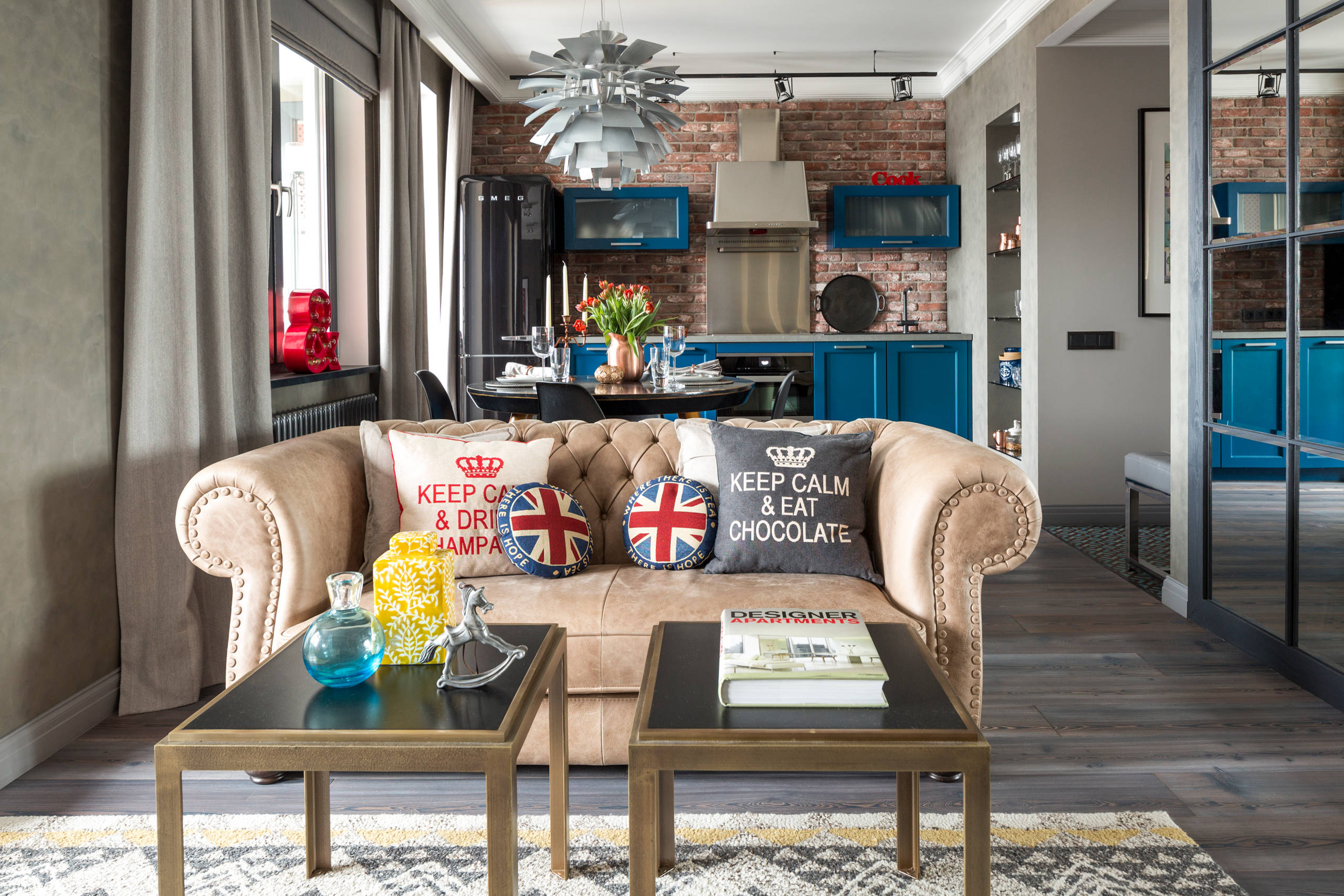 The most popular colors of loft design: black and white, blue and silver, red and sand, wood and wine.