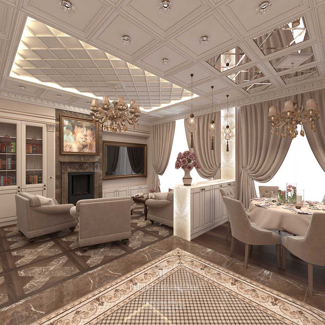 Much attention is paid to the design of the floor - tiles, marble and parquet are laid with sockets in the center and frames along the edges, the asymmetry of the pattern is welcome.