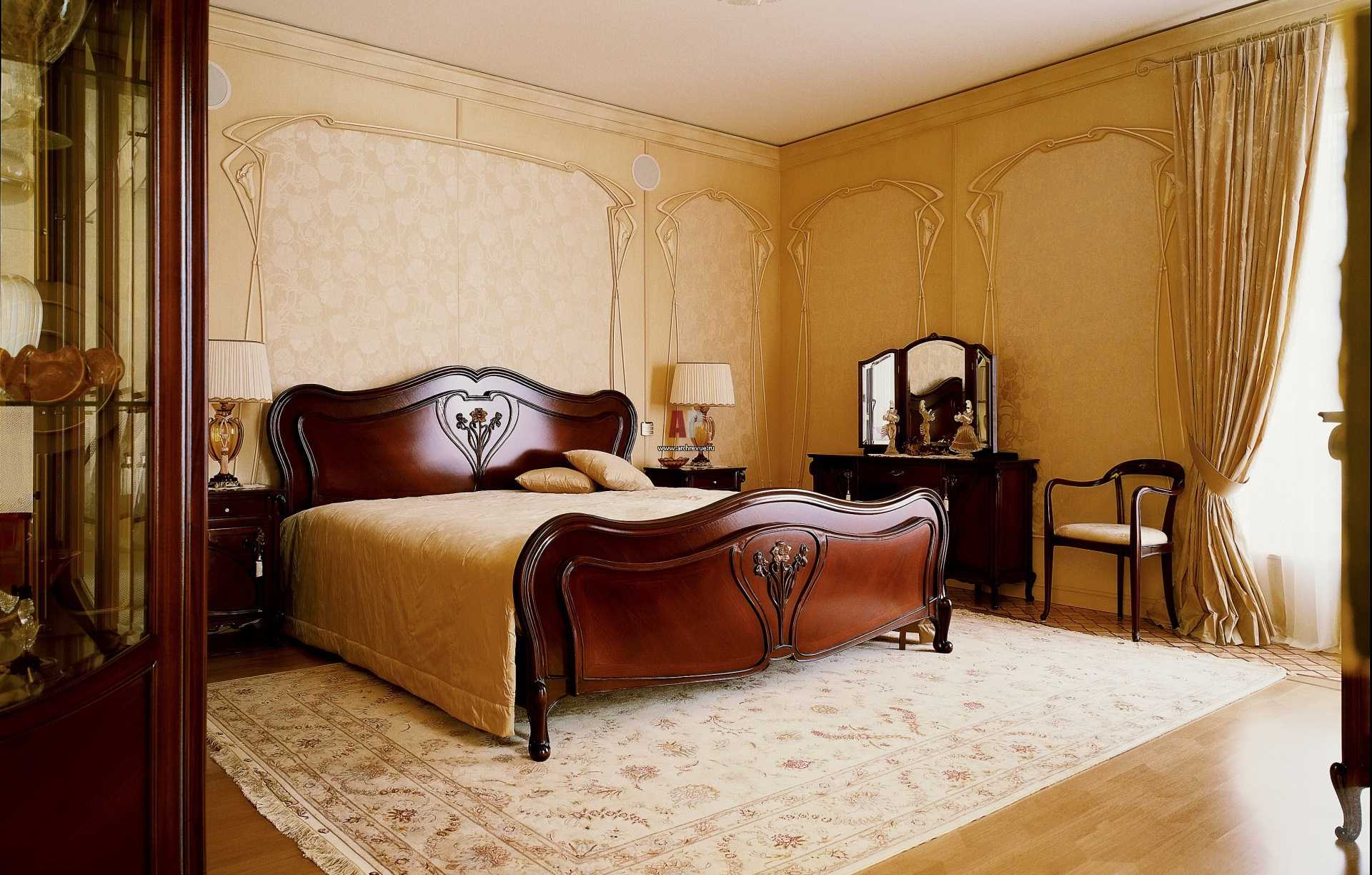 Suitable furniture is half the battle, it remains to pick up a soft mat with a pattern that duplicates the soft forging lines of the purchased bed, plus textiles that are suitable for the shade and pattern. Beautiful bedroom windows should not be tightly curtained - a light monophonic tulle will complement the decoration. It is better to sew the curtains yourself, adding a blanket from the general curtain fabric. Who does not know how to sew - it is easier to order the entire ensemble in the cabin according to the proposed sample. Art Nouveau welcomes garters, folds and draperies of curtains, multilayer asymmetric lambrequins on elegant cornices.