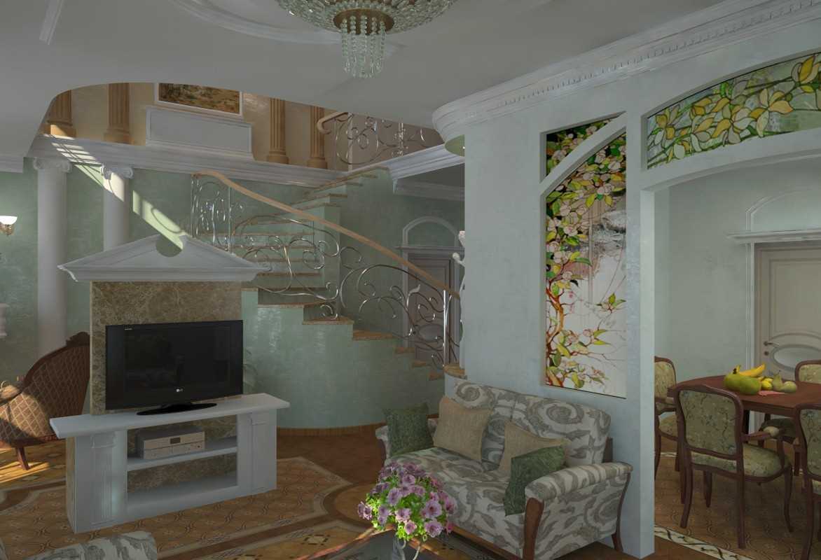 Art Nouveau style in a modern interior is able to most organically combine all the elements of architecture, planning and zoning through the harmony of decoration and decor. Nothing “falls out” of the general concept, therefore, with the independent design of the house, you need a visualization of the idea or a preliminary sketch. This approach will help to assess the advantages and disadvantages of the design of individual rooms or functional areas. It is recommended to duplicate some of the decor elements, for example, in the insets of interior doors of adjacent rooms and stained glass partitions.