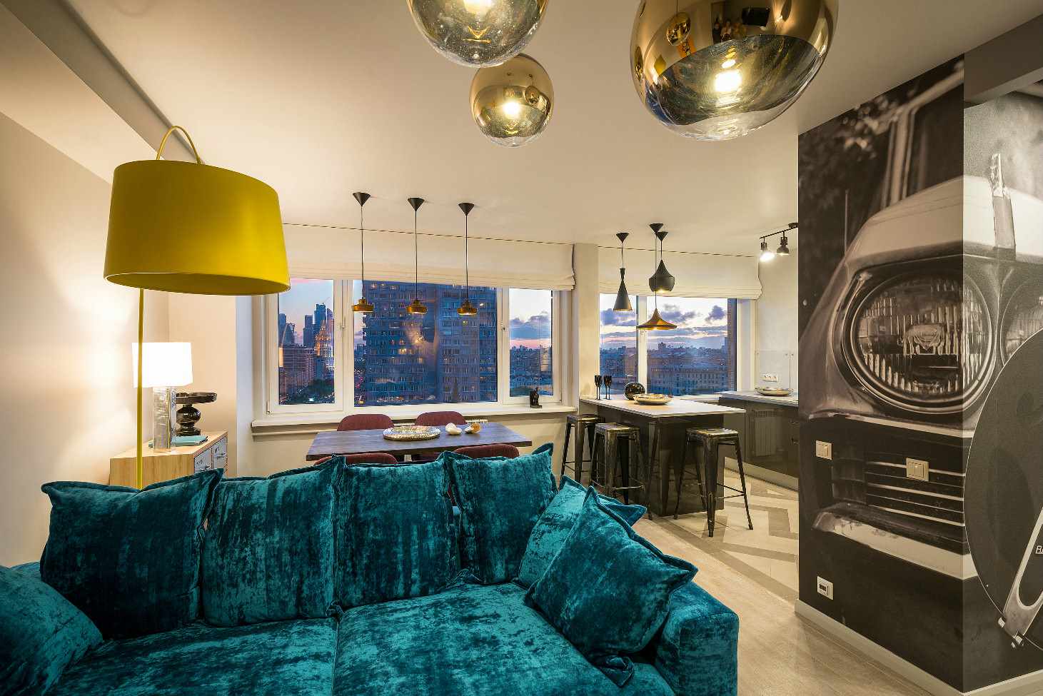 It is important to use a lot of pop style decor: unusual flower vases, lots of colorful pillows on sofas, and a maximum of lighting. At the same time, the more unique each detail is the better.