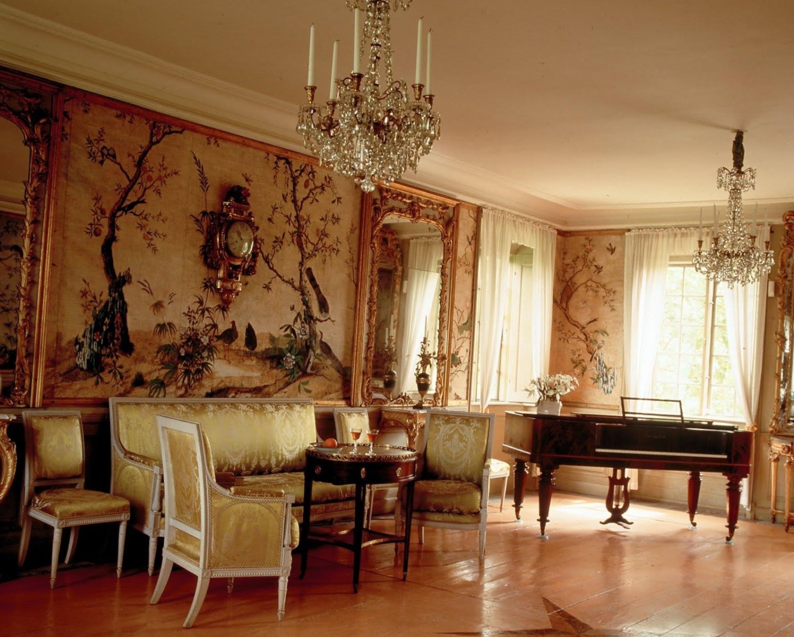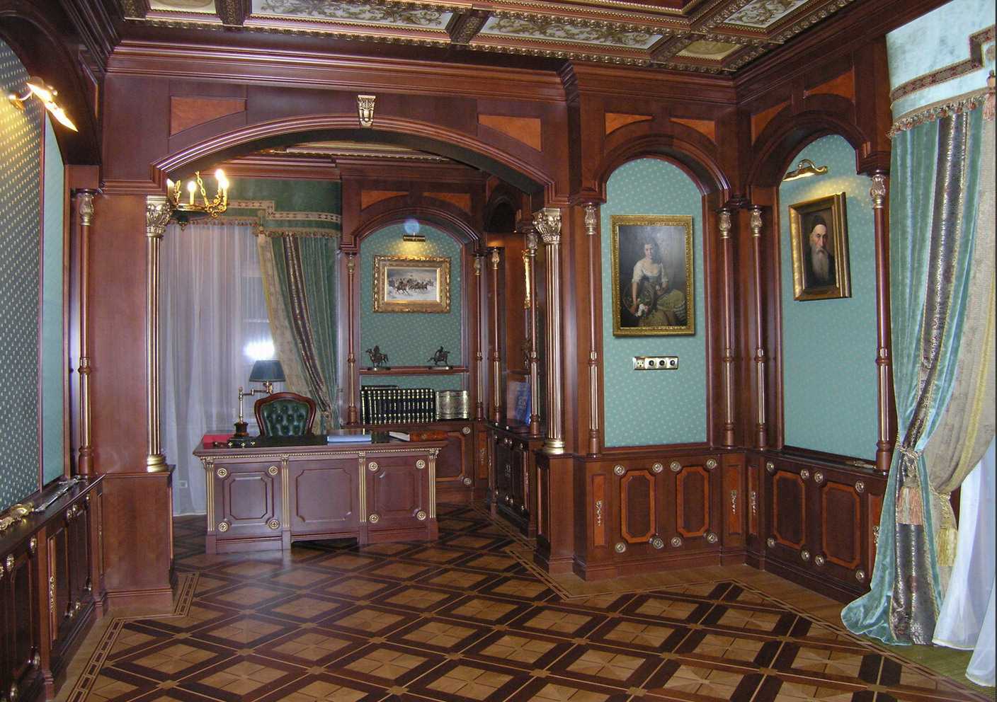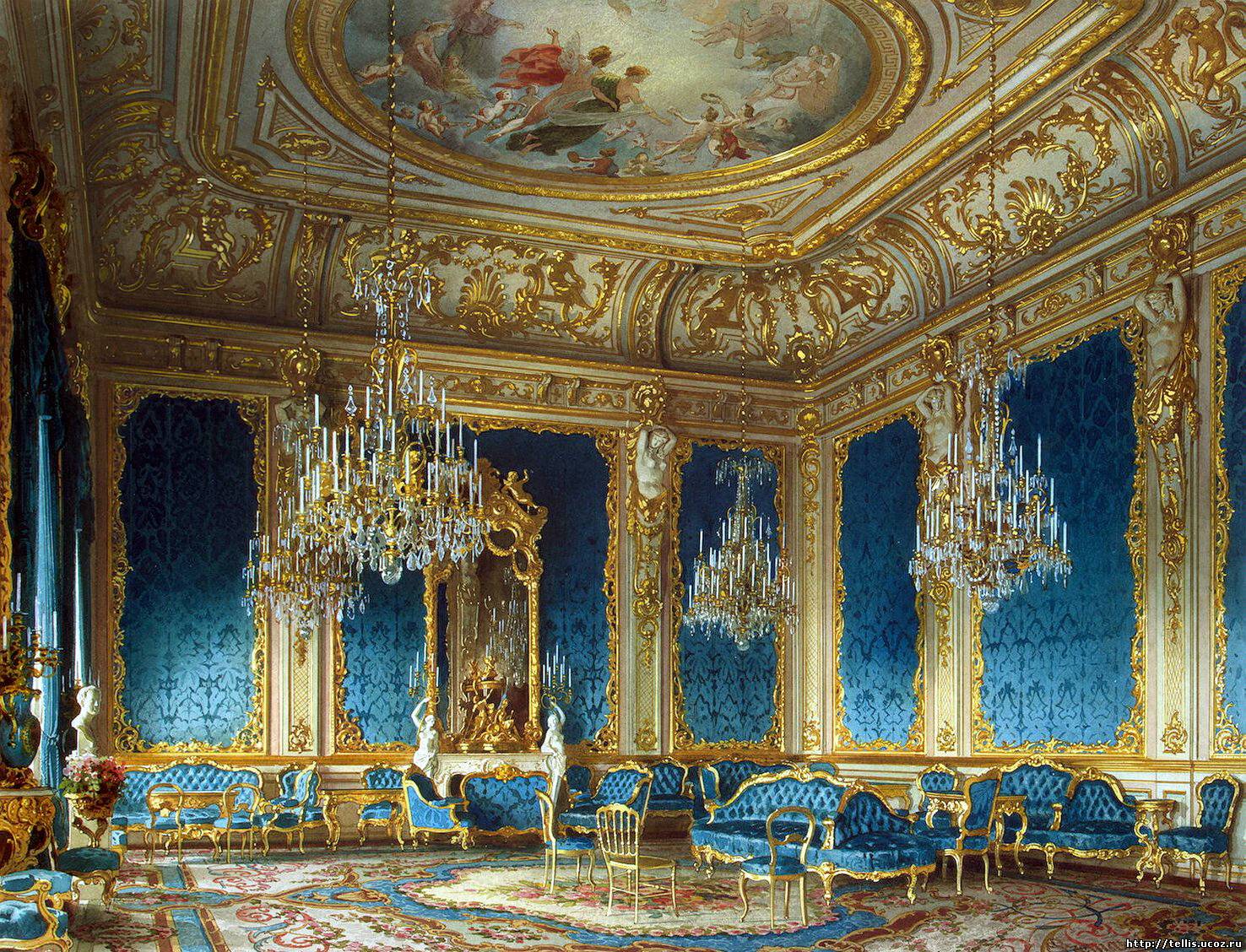 - design of all surfaces: wall painting, rich ornaments, carving, gilding on furniture;