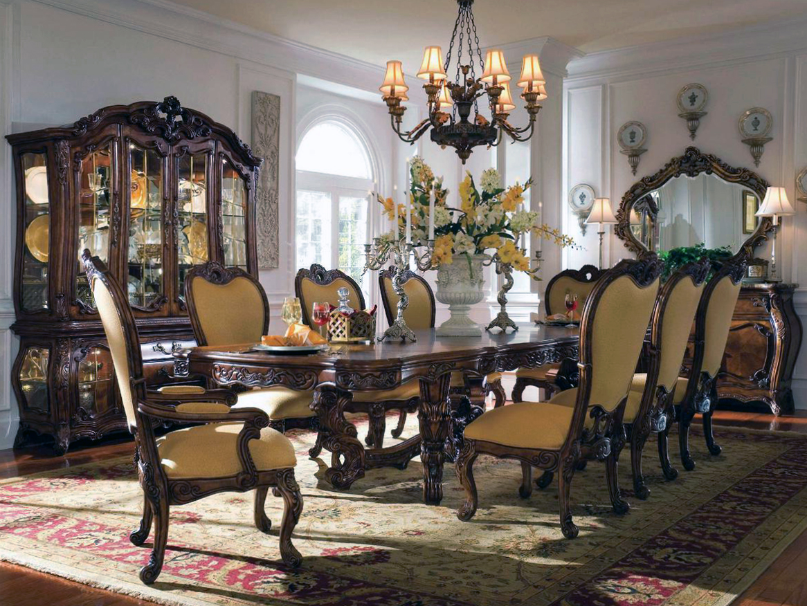 - large details (frescoes, sculptures, gilding); - color contrasts; - massive furniture; - expensive fabrics |
