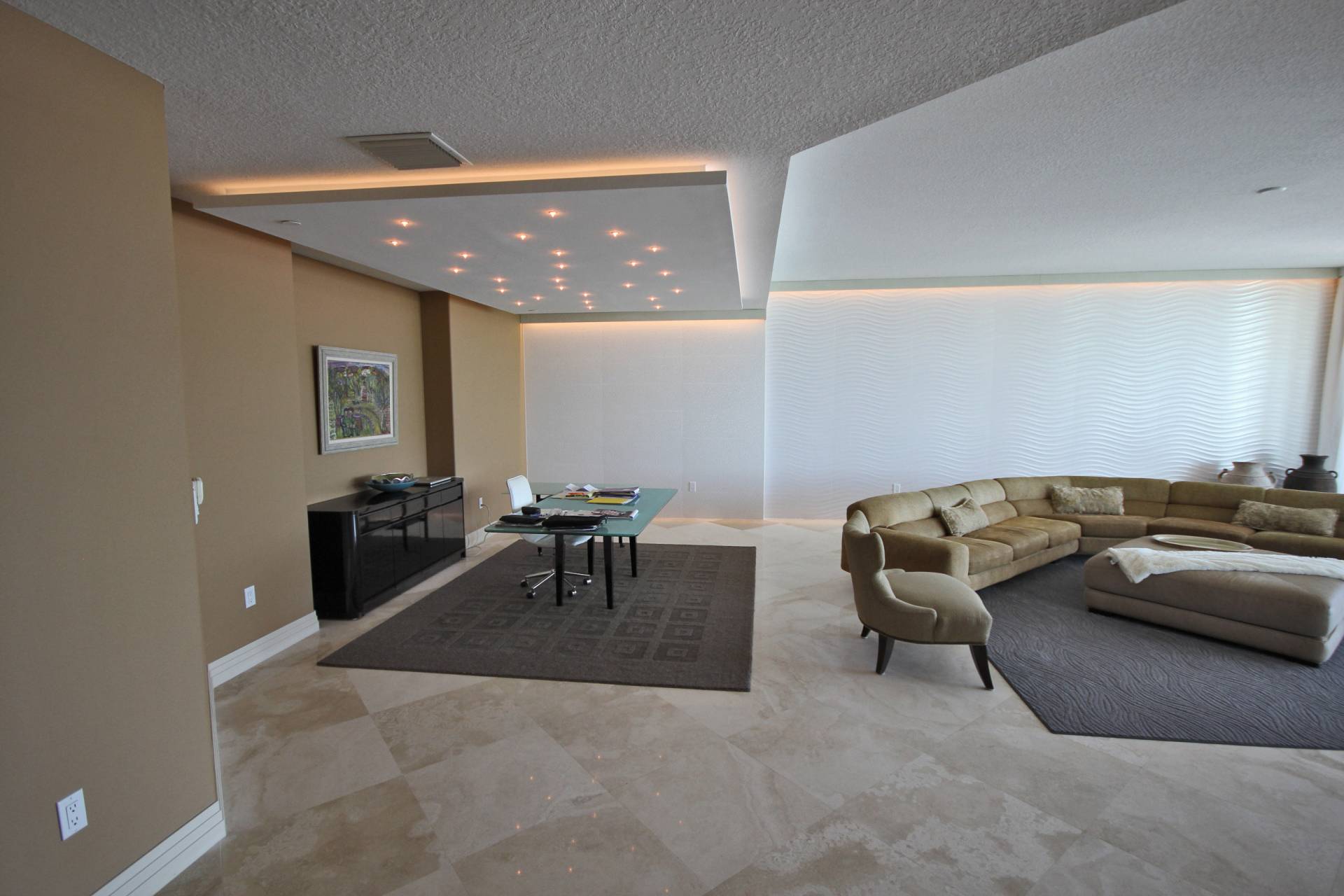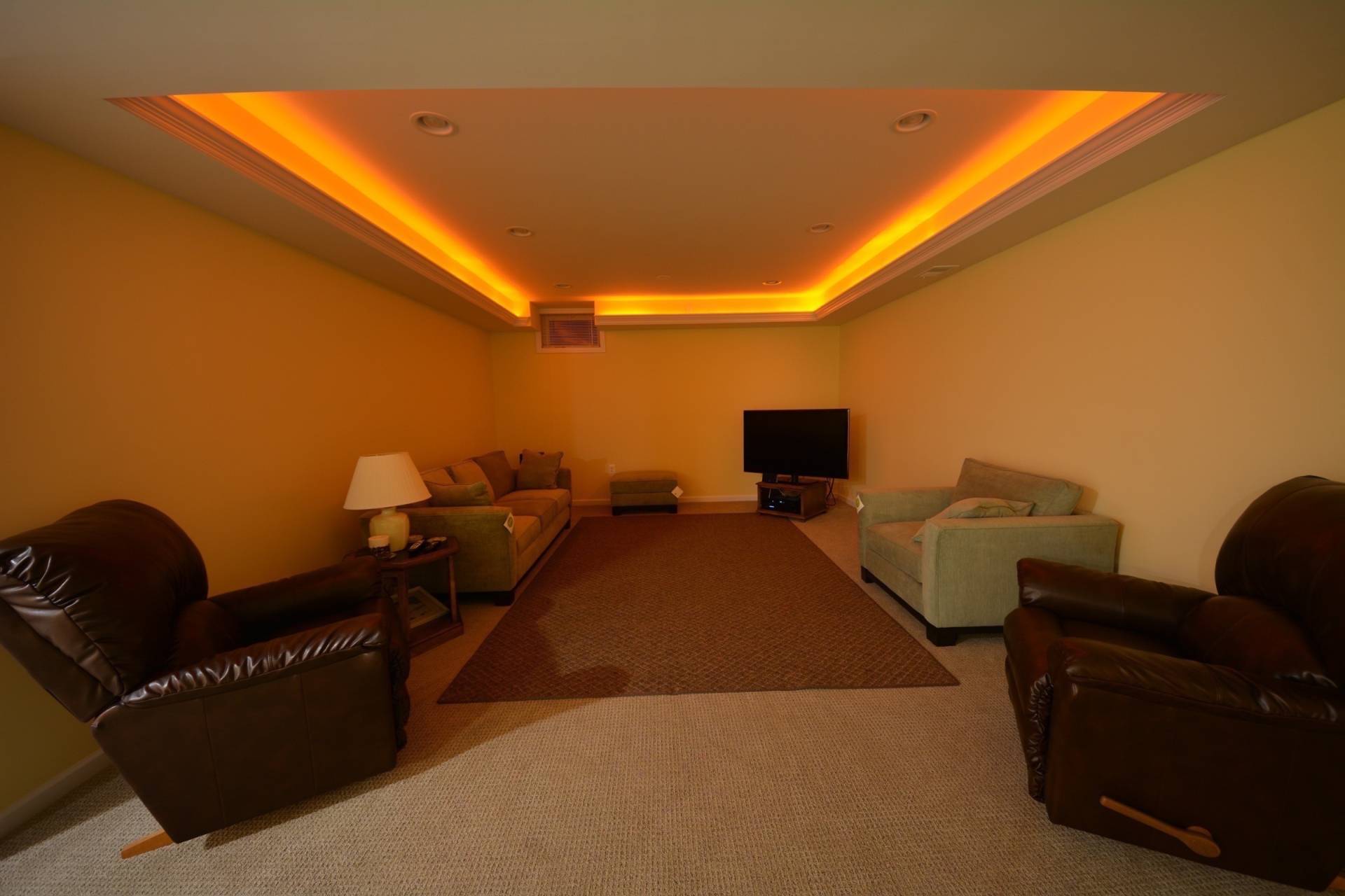 Usually a combination of ceiling lighting with backlighting on the wall or on furniture is used.