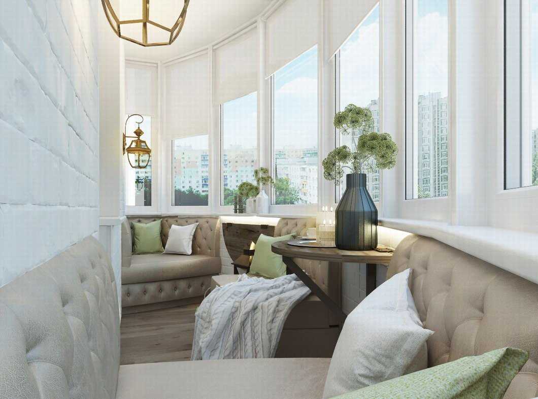 This space is used for a day siesta, evening gatherings or as a place for tea drinking.To create a fresh and relaxing atmosphere in the loggia, use a large amount of white in combination with all shades of green. On the floor you can lay a rug with a long pile, and add the composition of a soft sofa with pillows. Or buy wicker rocking chairs and complement the idea with a small glass table. In any case, light colors should be used for the decor. Since the loggia is equipped with a large number of windows, it will look even larger, creating the perfect mood for relaxation and work.