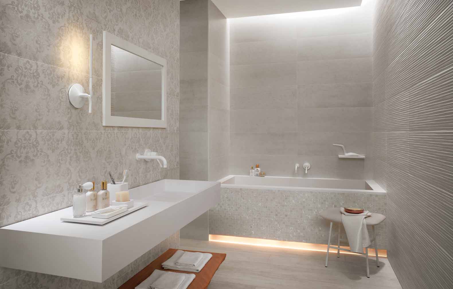 When decorating walls and choosing plumbing and furniture, you can use not pure white, but slightly bluish or beige tones. The first shade of the tile will make the room colder, and the second a warmer look. In the first case, it is worth adding blue or blue decorative elements, in the second - the spectrum of possible tones is much wider: from light brown to deep purple. Another winning design option is a tile with a pattern of light stone. |