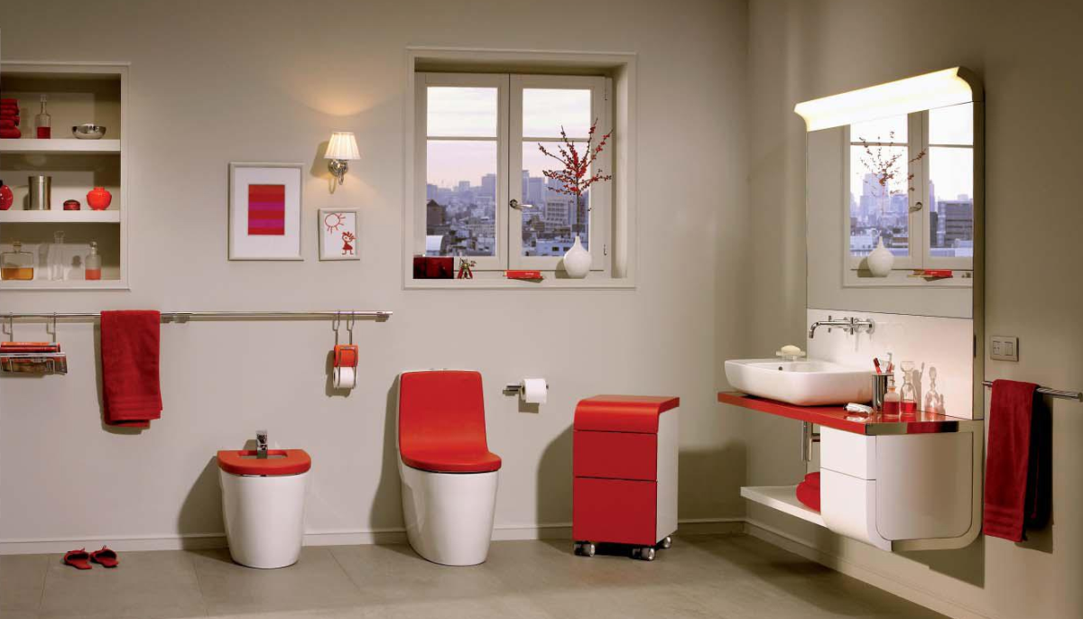 The combination of red and white in the interior of the bathroom will look very beautiful.