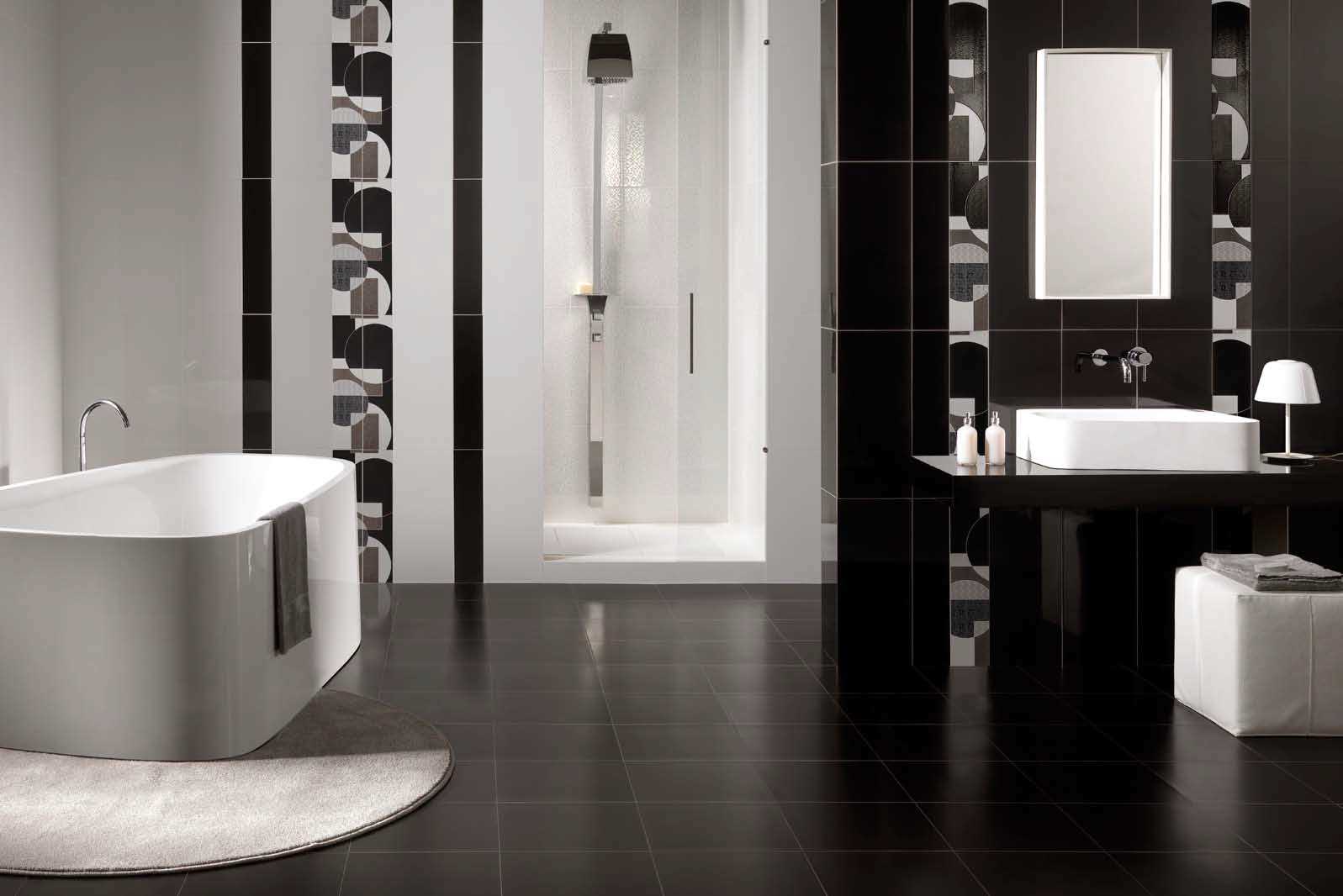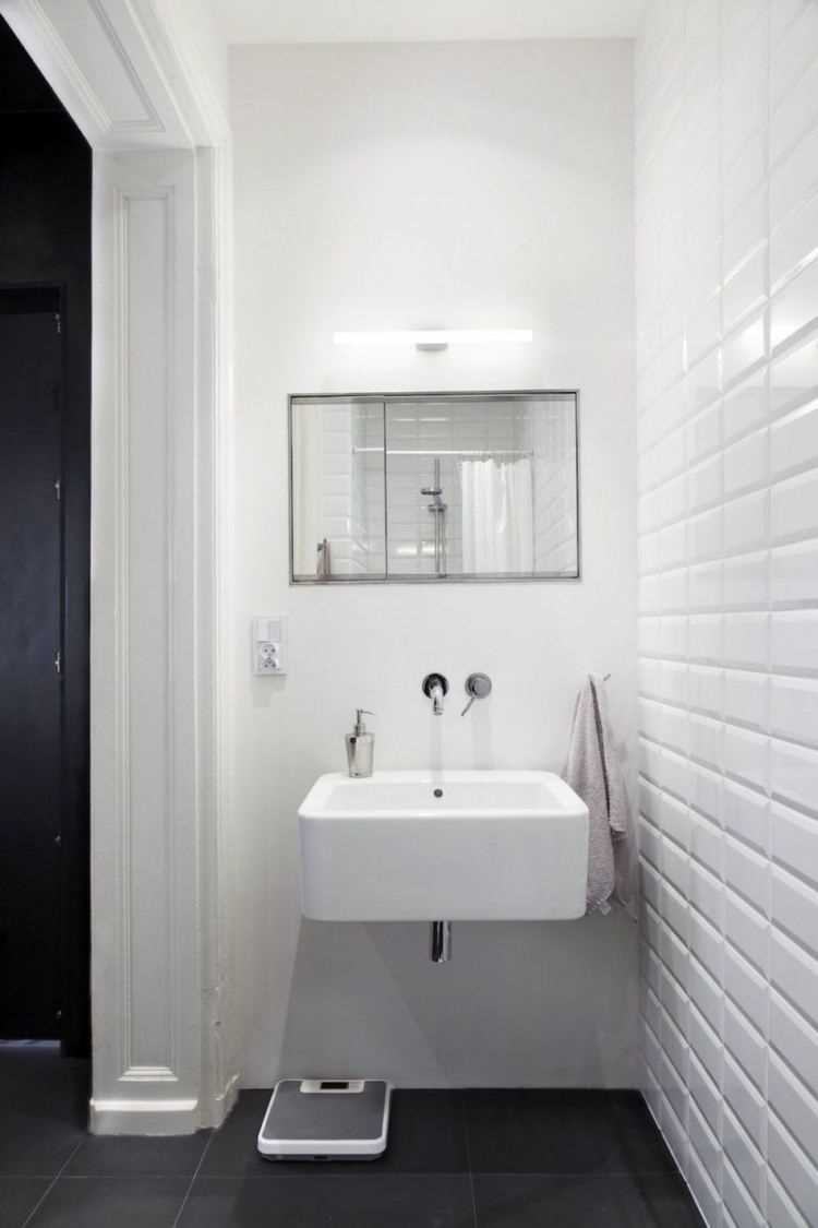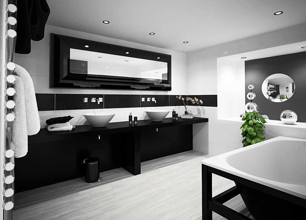 The combination of white and black in the interior of the bathroom looks very beautiful