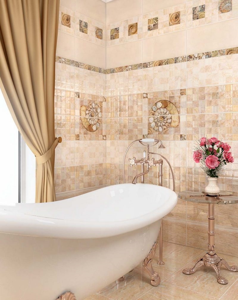 Ceramic tiles in beige colors - it is always fashionable, stylish and practical. If you select a material with a pattern, then it will not be noticeable small pollution, water droplets. To choose the color of this type of finish is based on the area of the apartment.