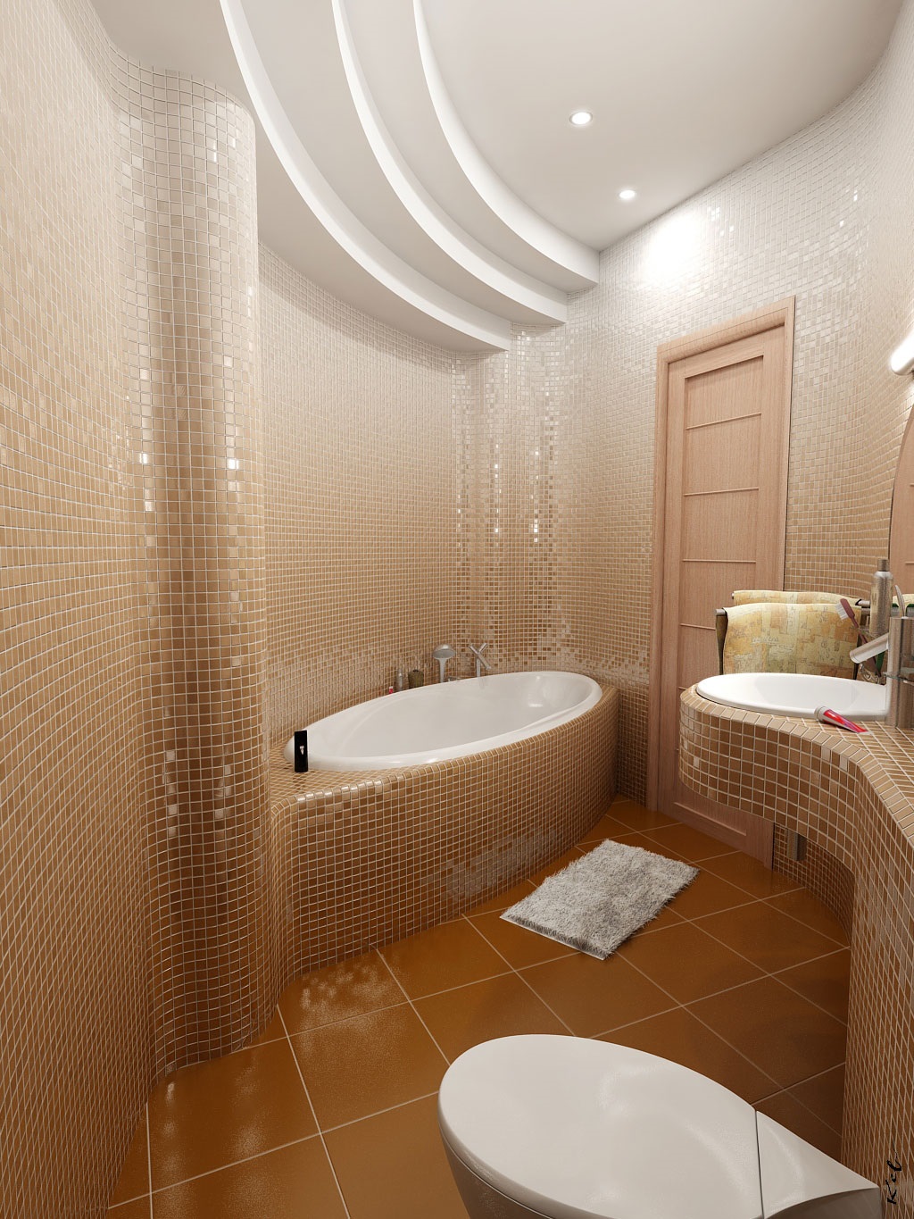 The use of mosaics on the floor and walls. You can dilute the warm, muted colors with brighter accents, for example, with small squares of water, mint or peach. The randomness on the floor created from different colors of light brown ceramic tiles will also look beautiful.