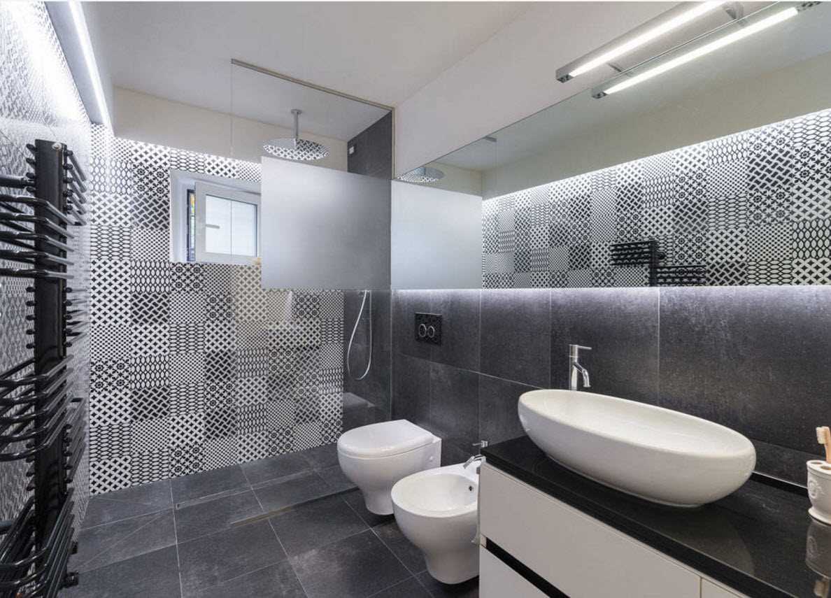 The combination of black and white in the interior of the bathroom will look very beautiful.