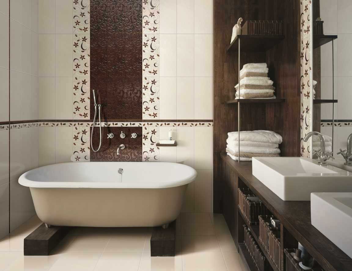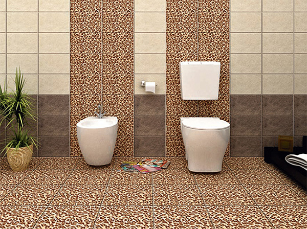 The design of the bathroom is made in chocolate color of ceramic granite