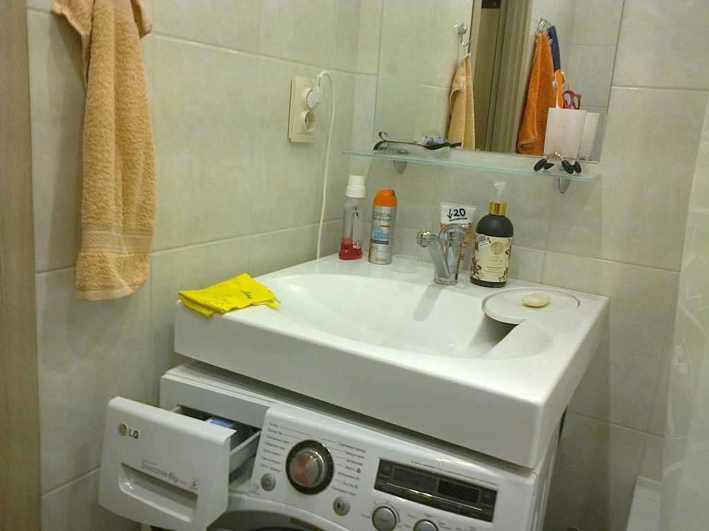 To save space in the bathroom, the washing machine can be placed under the sink