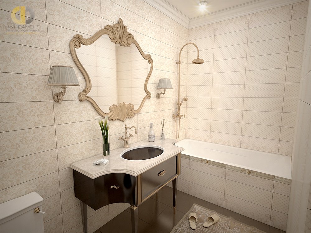 Lovers of plain walls should diversify the bathroom decoration with colored tiles on the floor - this design will bring novelty to the classic design. Linear contrasts and mosaic rosettes on the lower plane look especially exquisite if the walls are plain or with blurry ornaments.
