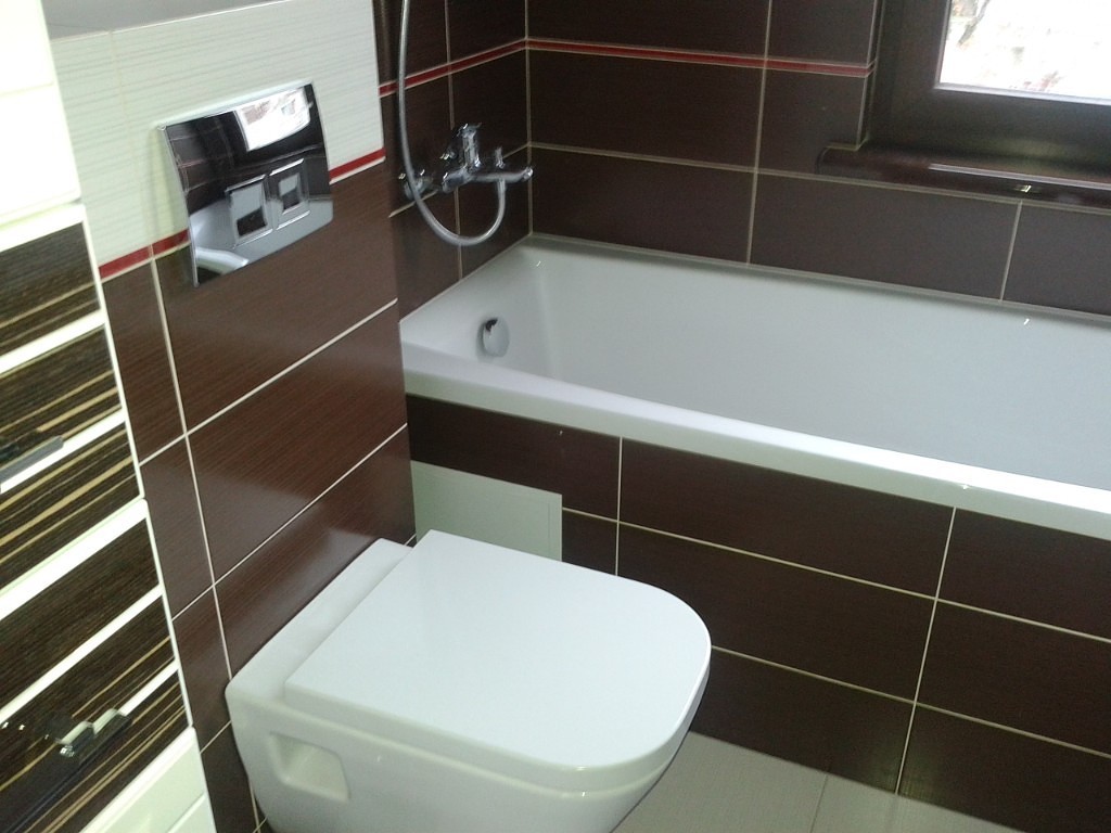 - In small bathrooms, where in addition to the bathroom the toilet is located, using mosaic tiles to visually expand the space, indicate the zone. Separating the floor and walls with different mosaics, separate the functional areas. Material or color may vary. Framing elements, such as stripes, look spectacular.