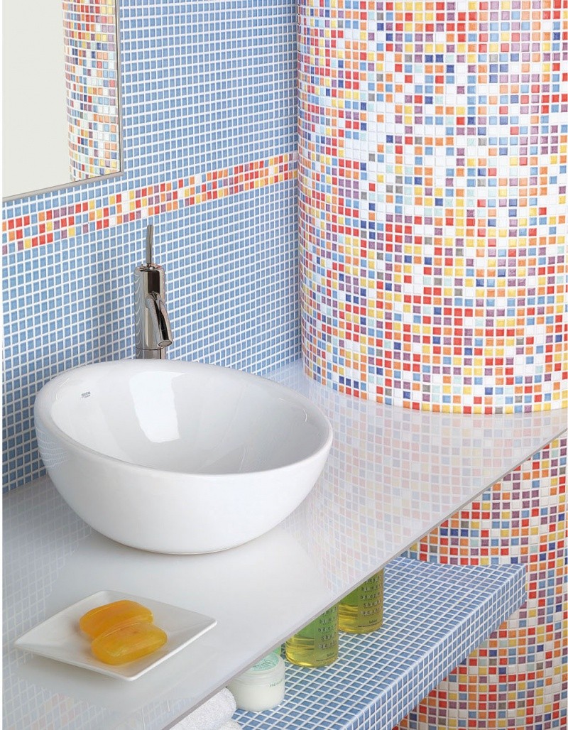 - It is convenient to finish round surfaces with a mosaic. So you can highlight the bath, wash basin, niches, shelves.