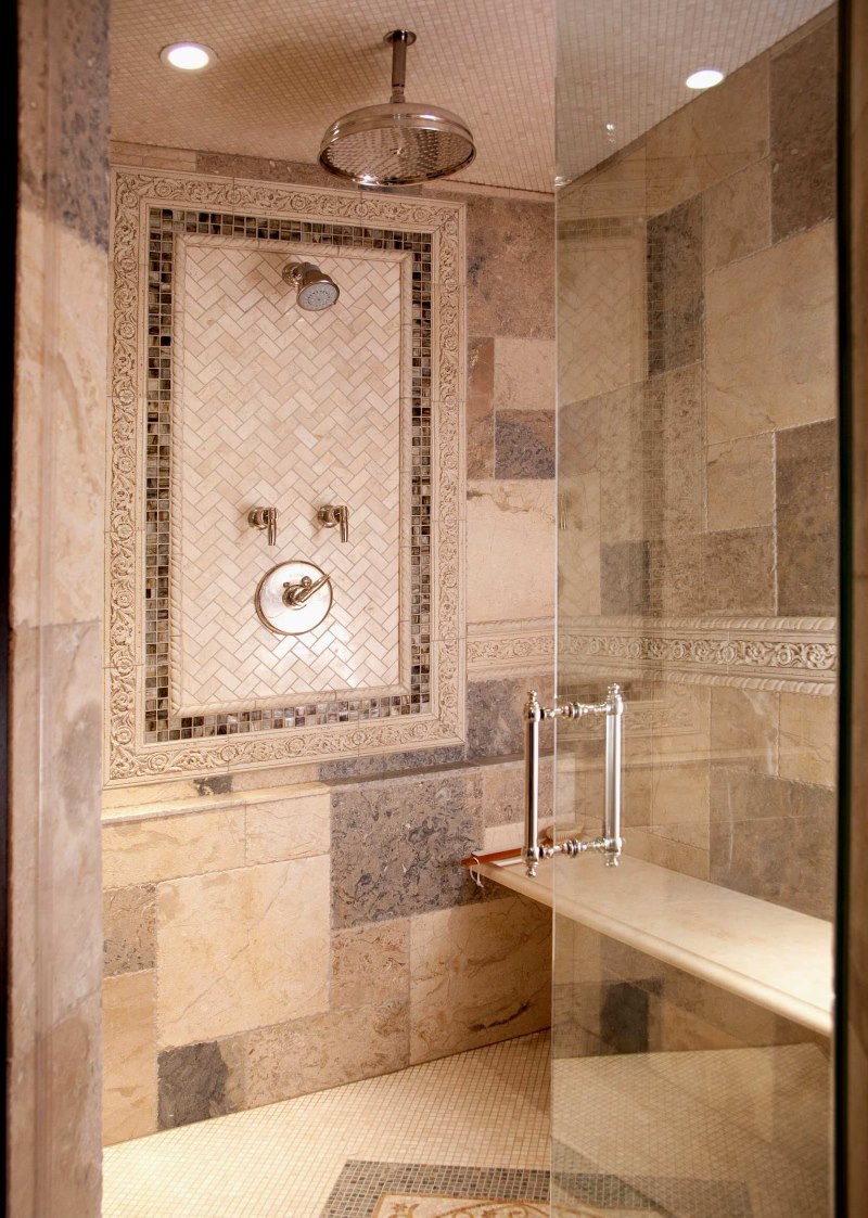 The high price of natural stone.Slightly lower cost of artificial. | Operational properties depend on the type of stone. Due to brittleness and high moisture absorption, limestone is not recommended for use in the bathroom. Stone mosaics perform the total cladding of walls, ceilings, floors, drawings, ornaments. |
