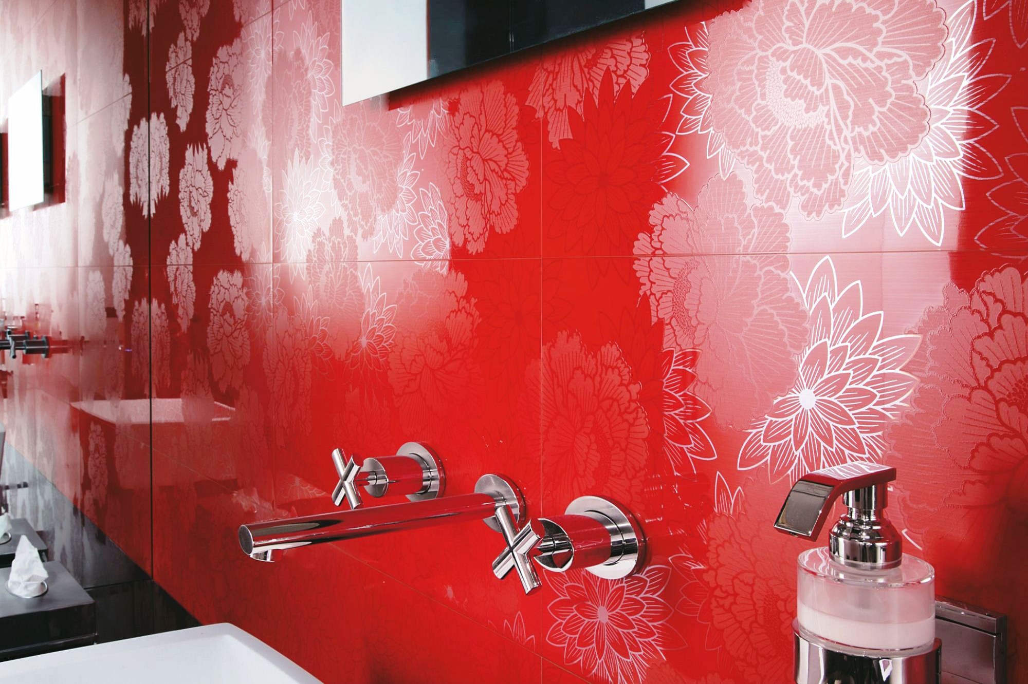 - Red. Modern and stylish color for decoration bathroom. It goes well with white. Used in oriental style and art deco. You can decorate with large red tiles only one wall, focusing on it.