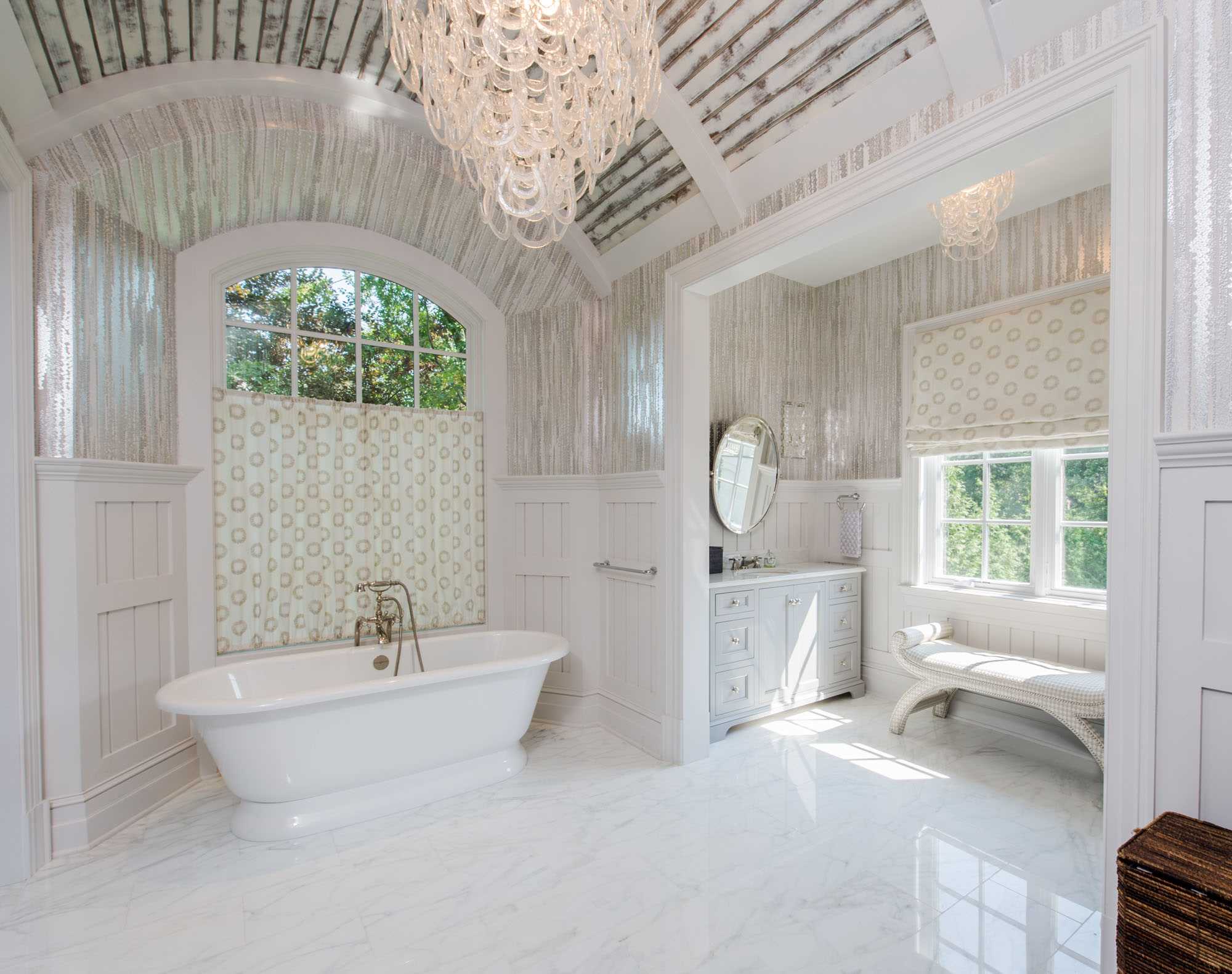 The classic-style bathroom is characterized as a spacious and bright room. A white bathtub is installed in the center, furniture is only the most necessary, as shown in the photo. The area of the room is used rationally so as not to create a sense of clutter. This composition will allow you to relax and relax the occupant.