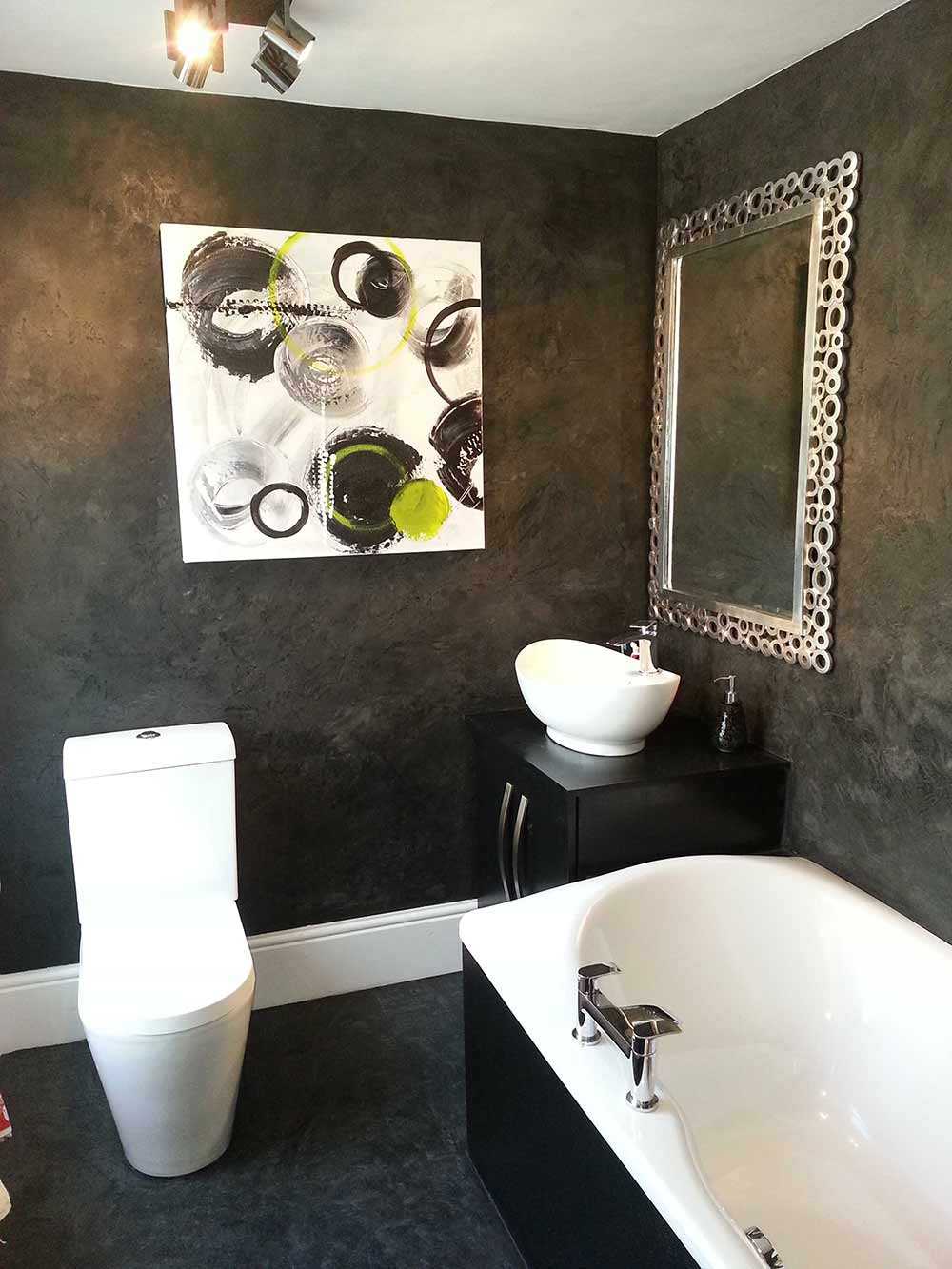 Condensation does not form on the plastered cold wall, as on plastic panels and tile materials. Finishing the bathroom with decorative plaster will provide an aesthetic surface with flawless operation.