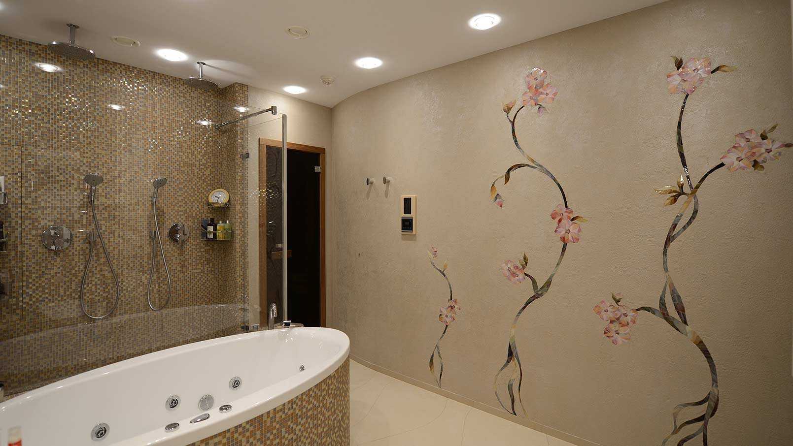 In those cases when the bathroom is equipped with a shower box, an oval "font" in the center of the room or a mini-pool with a podium, decorating the bathroom with decorative plaster will be ideal.