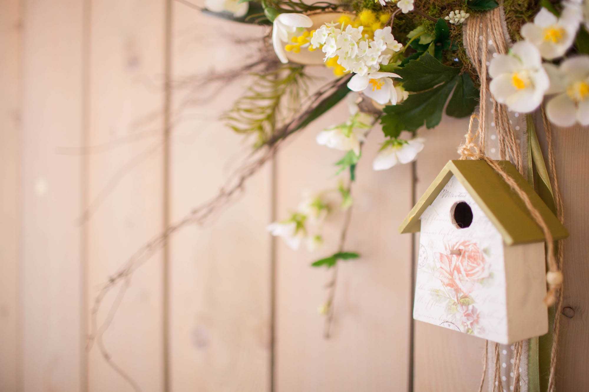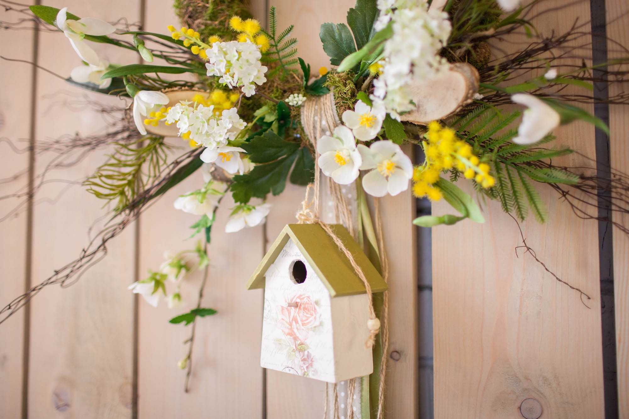 If buying flowers for you seems like an expensive undertaking, plant lawn grass seeds in a small bowl with soil. They will sprout on the windowsill and will delight you with fresh herbs. Auxiliary decoration to the house are birds - their images, figures, figurines. Diversify the interior with butterflies and hang a wreath with bows on the door. All this will look nice and appropriate.