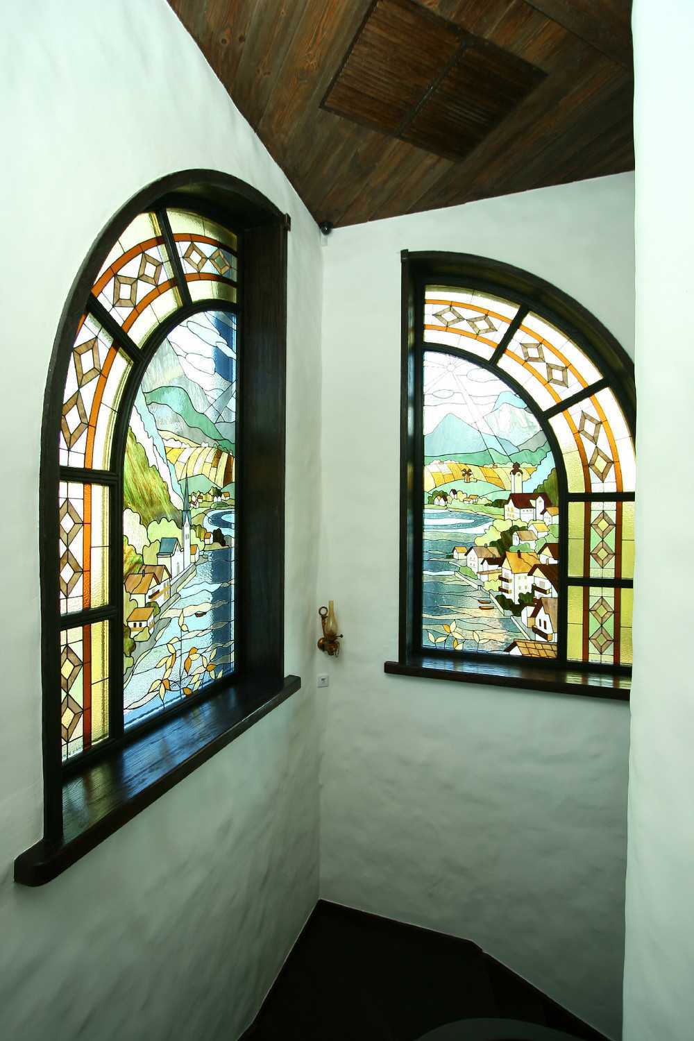 The stained-glass window in the window is more appropriate for a country house, mansion. Agree, in a multi-story reinforced concrete tower, such a design somewhere at the level of 10 floors will look ridiculous, but such a design will make a private house noticeable compared to other similar ones. Stained-glass windows in the interior will decorate not only the classic style, but also:
