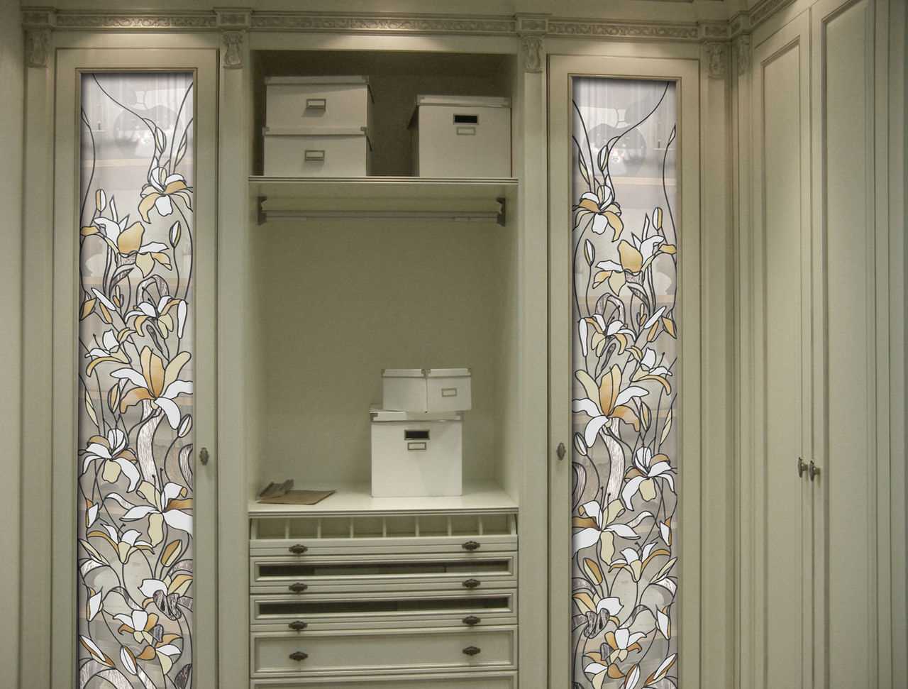 Stained glass furniture is a great solution for many styles. In the kitchen, cabinets with stained glass facades will be appropriate, in the living room - showcases for dishes, in the bedroom, hallway - doors of cabinets, dressing rooms. For sliding wardrobes often order mirror pseudo-stained glass or sandblasted.
