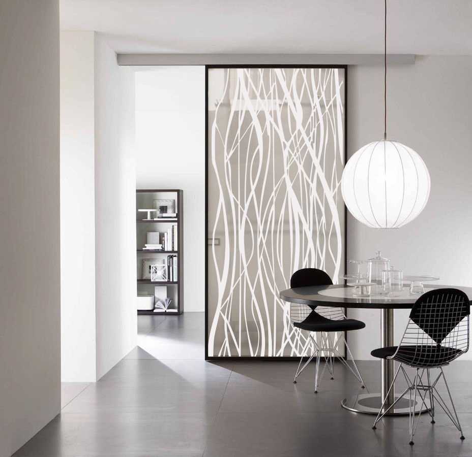 - Sandblasting. It is created by sandblasting glass and is more often used for facades of sliding wardrobes, interior doors, partitions.