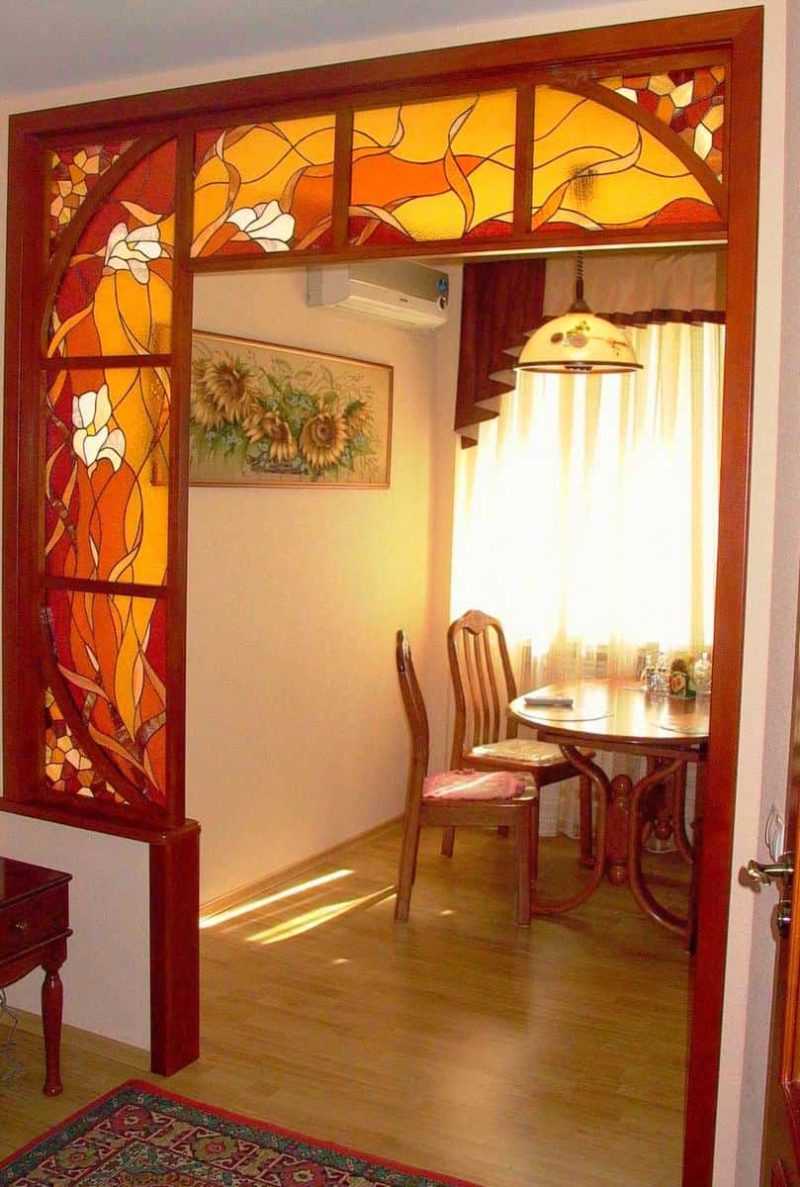 This is the most popular way to use stained glass in the interior. Interior doors become a means of stylization, a unique decorative element. In addition, they are a way to hide from prying eyes what is happening behind the door, for example, to the bedroom, the nursery, saving the owners from the need to install a blind door.