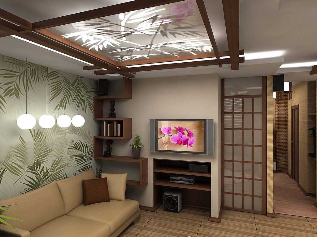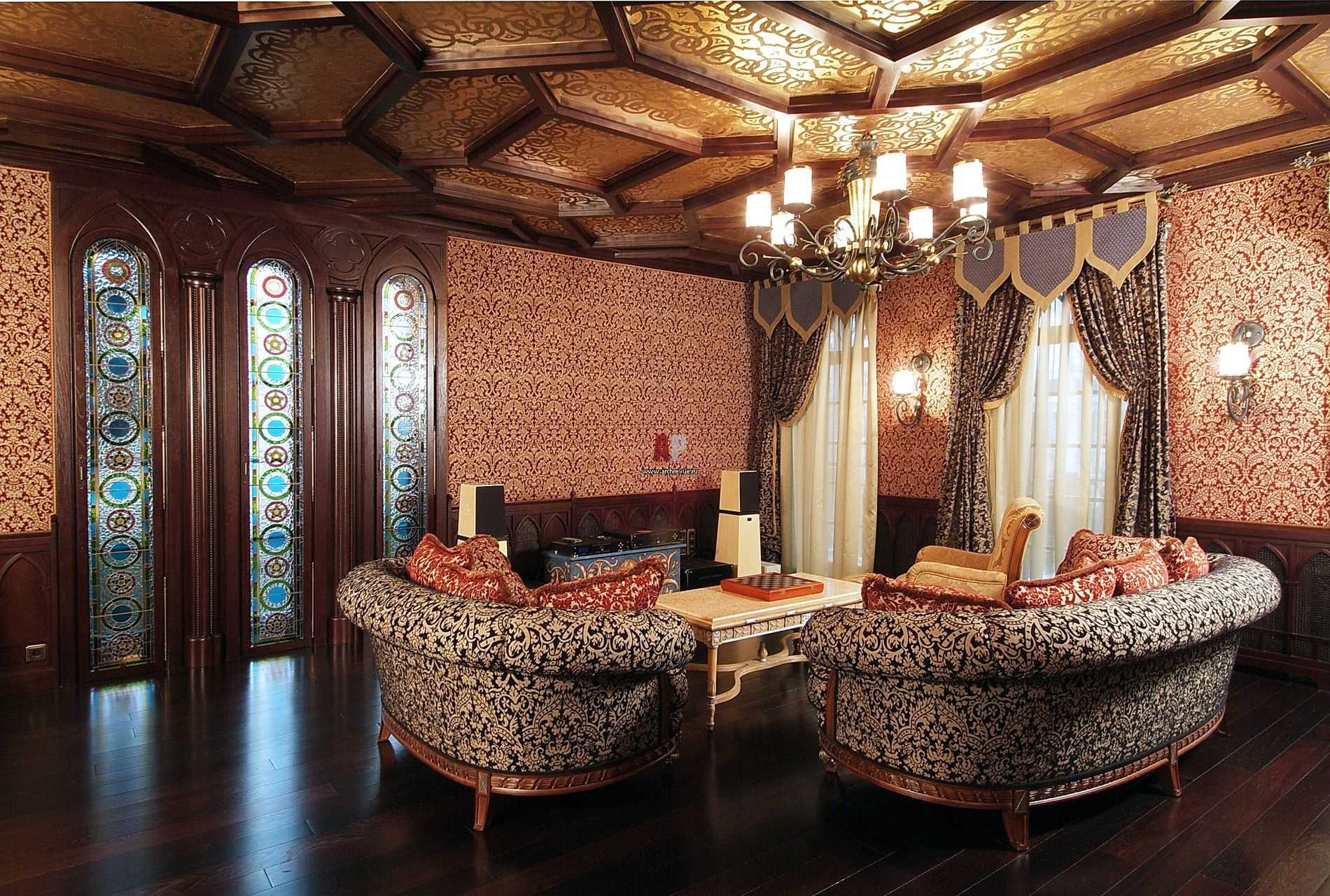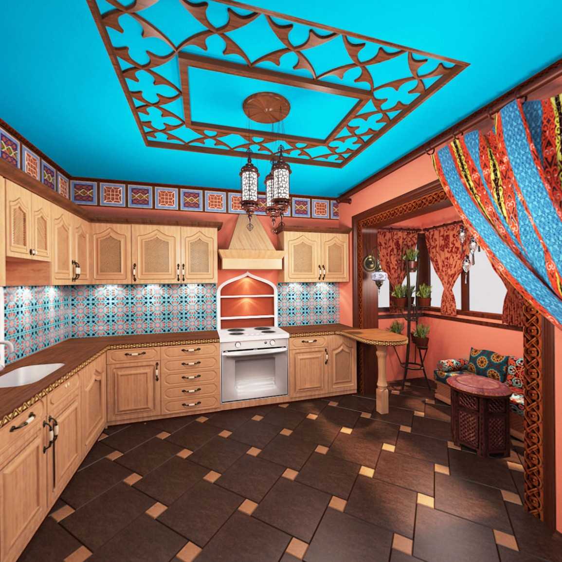 The oriental interior is characterized by smooth, soft forms with painting applied to them. The ceiling can be suspended, have several levels, it is popular to use decorative overlays with a variety of imitations.