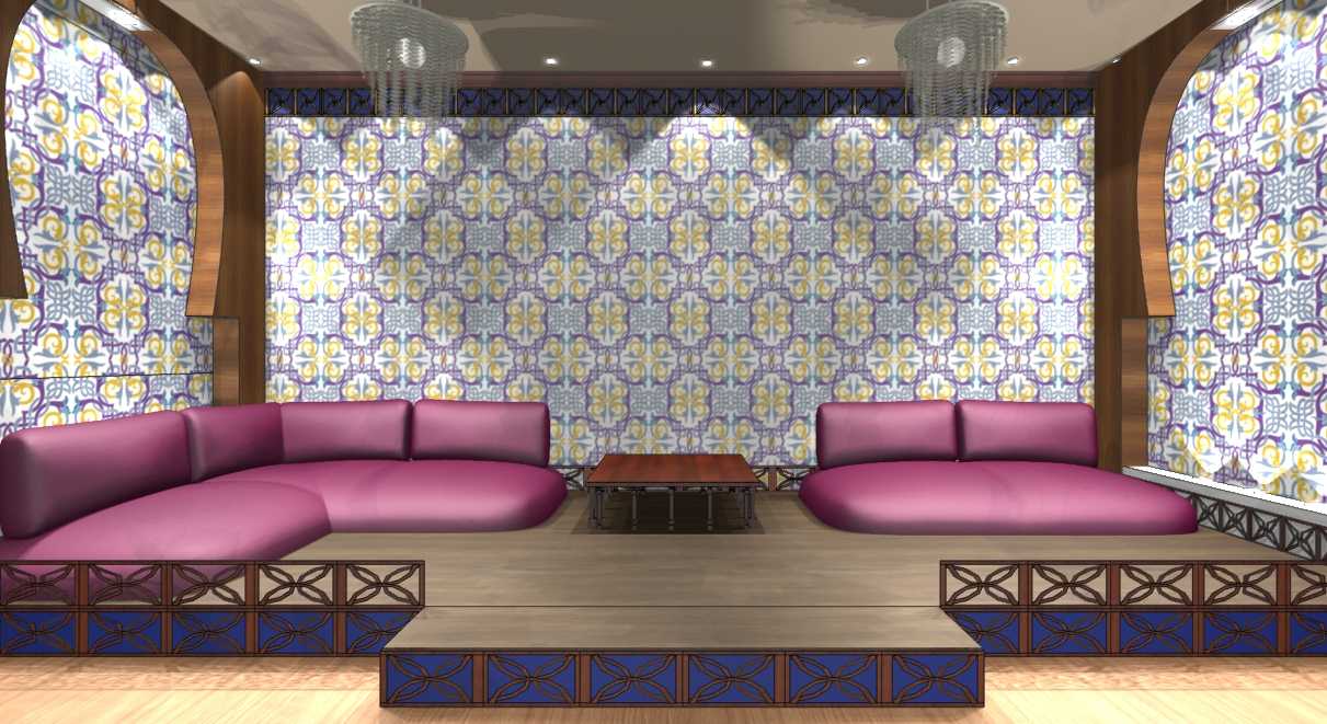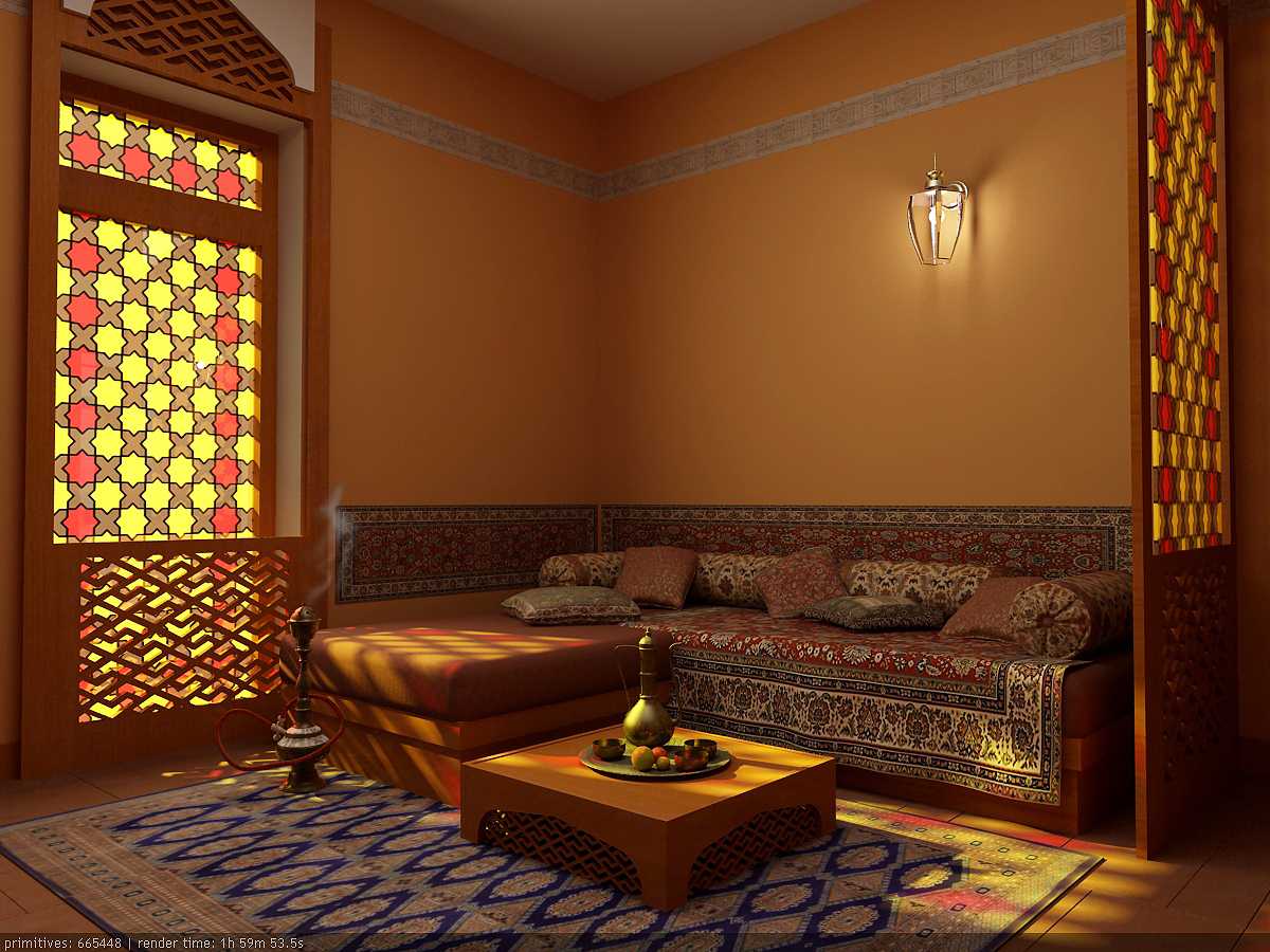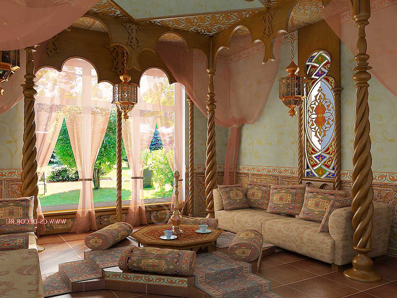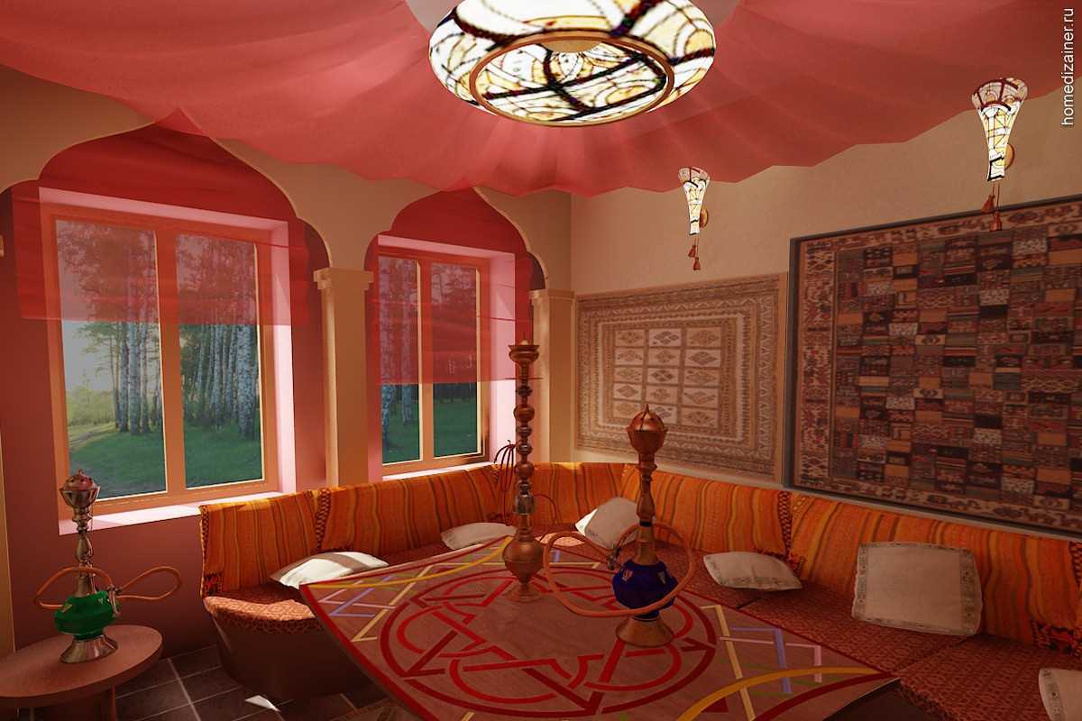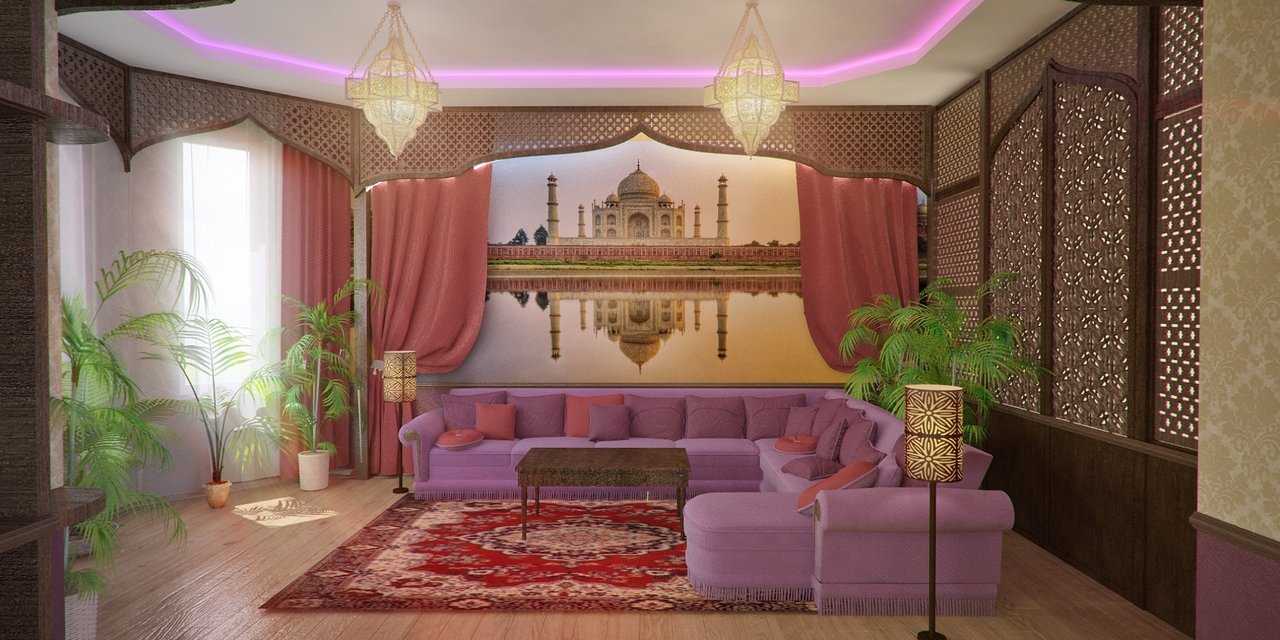 Classical Europeans will not be accustomed to oriental living room style. The color palette is used very colorful and saturated, preference is given to such shades as red, orange, ocher, peach, emerald, aquamarine, honey.