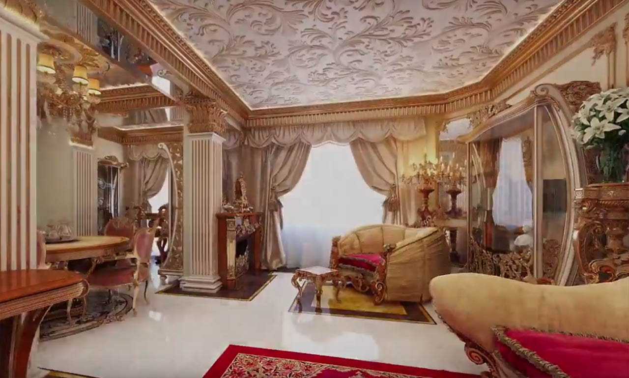 If the room is large, with high ceilings, then you can make them domed. Details are decorated with ornaments, paintings, and many lighting fixtures.