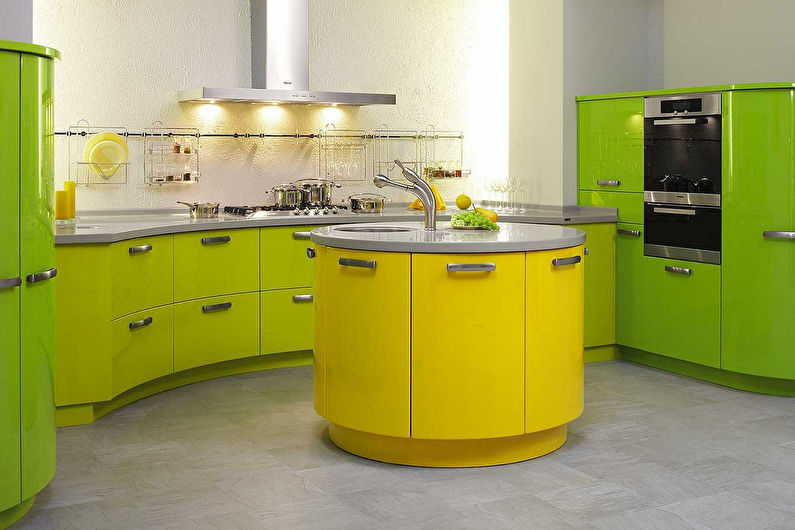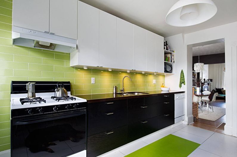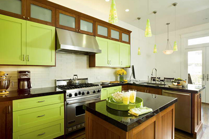 Warm and light green samples, according to scientists, stimulate appetite. That is why their use in the kitchen looks very natural and harmonious. In combination with white, orange, lemon; fruity or floral prints produce a soft, comfortable atmosphere.