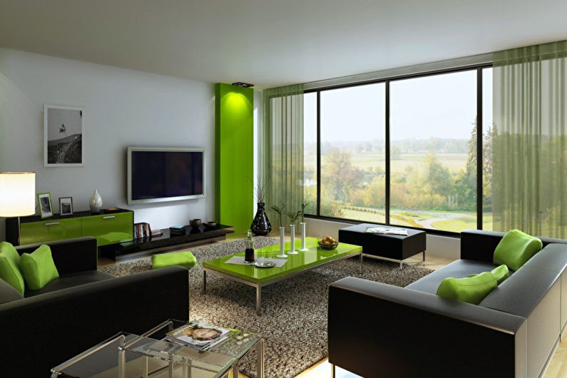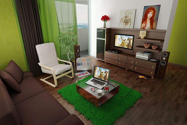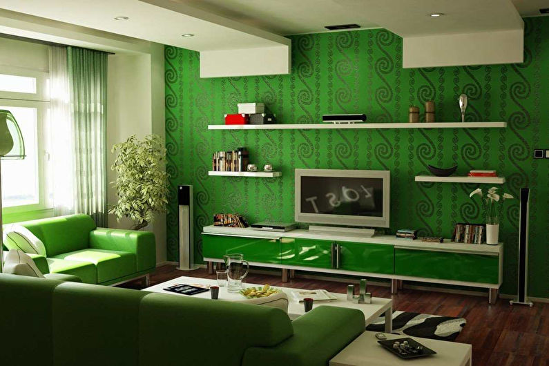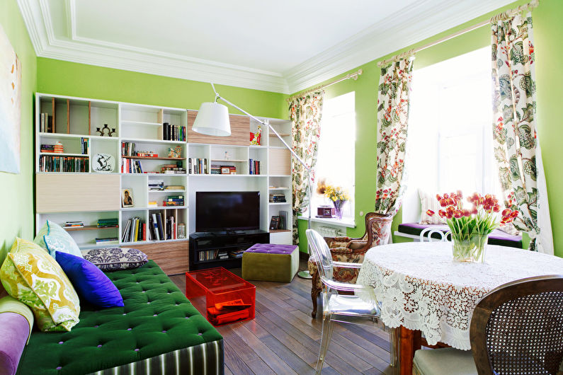 The interior of the living room can be solved in different ways, its design involves a certain freedom. However, green is most often a good idea in this situation. Even such trifles as green curtains, posters, bedspreads very refresh the room, make it more lively and light.
