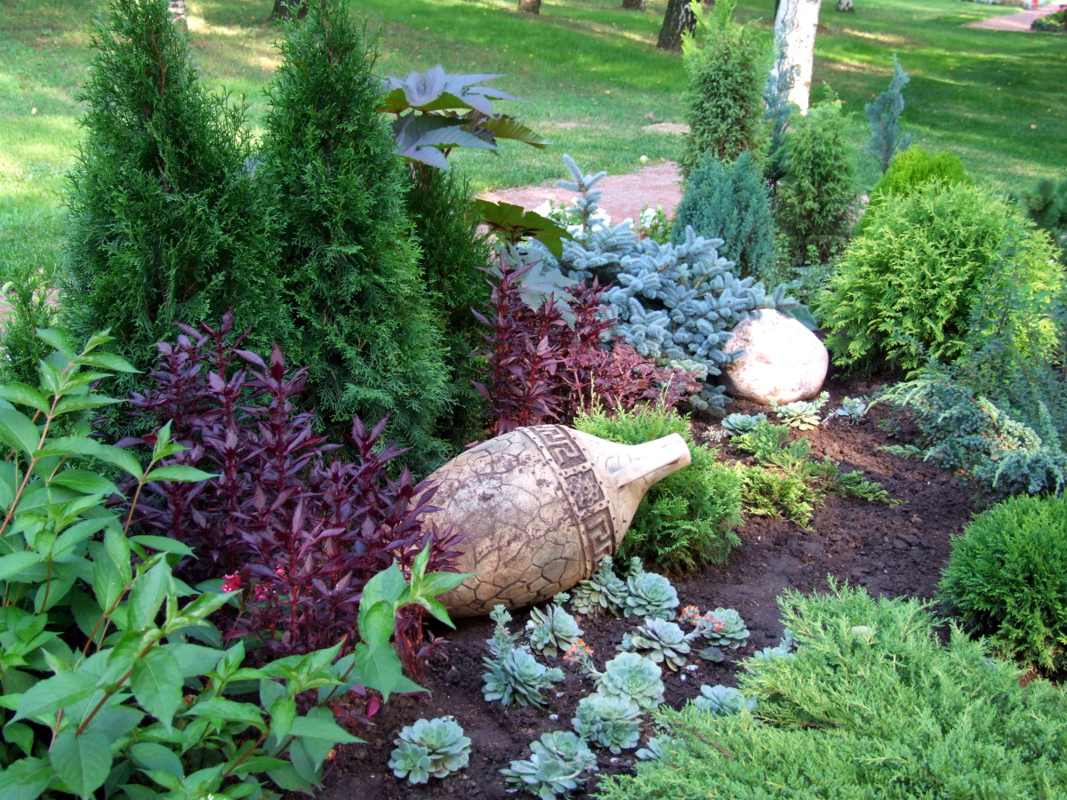 Adding a bit of ease will help seating all the greens in layers. Such a landing consists in placing the highest rear views, after them they are of medium size and only then small ones. It is important to choose the right color scheme. You can not combine cold and warm colors. Only one group is recommended.