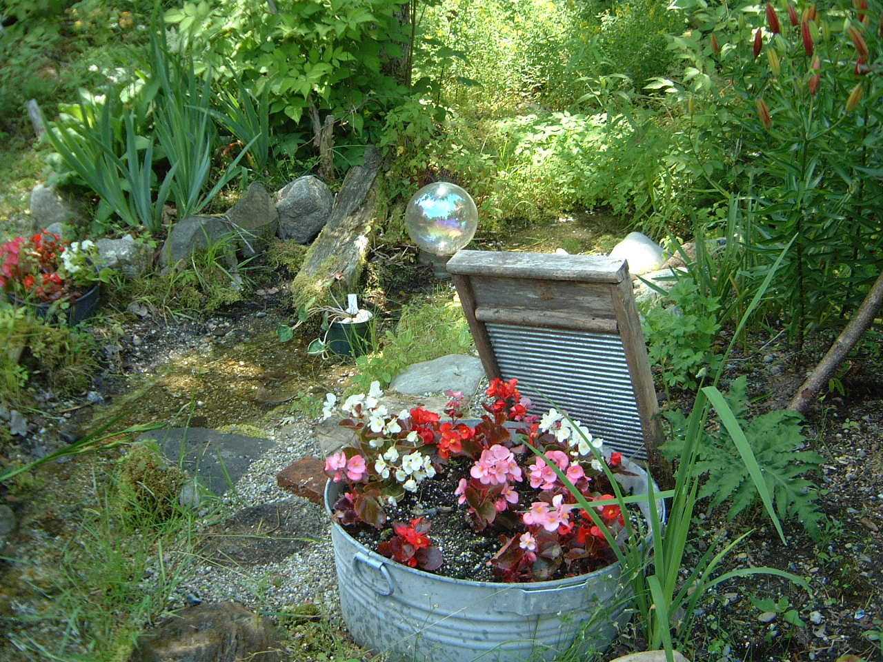 Old baskets and leaky tubs fit into the landscape design no less organically. For the decor of the site with your own hands, everything is suitable that is without a bottom, but with good walls or sides.