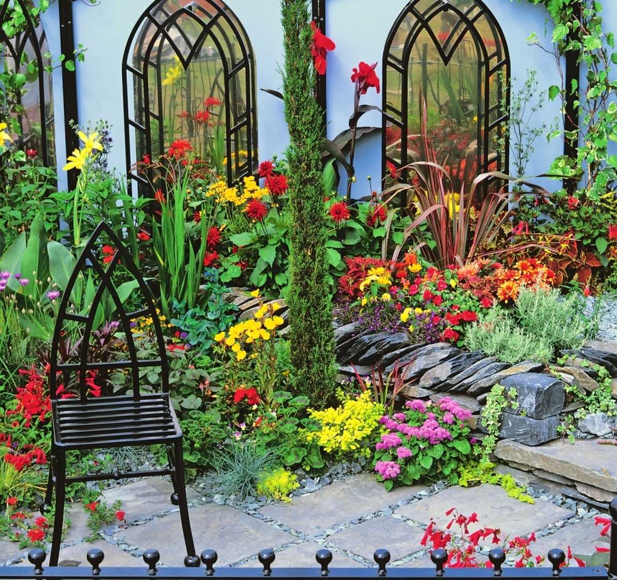It’s a pity to throw out old Viennese rattan chairs with an ornate frame; they will also serve as an original flowerbed on a green lawn.