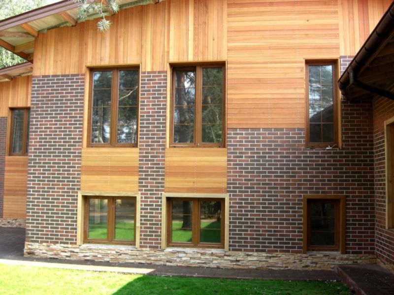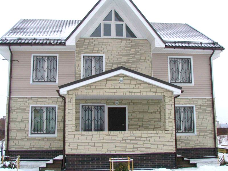 If imitation of a brick or chopped stone is used, it is worth paying attention to the color of the grouting composition in order to achieve the most expressive effect. If the base and perimeters of the openings are faced with large elements, and the planes of the walls are smaller, then the exterior becomes monumental and respectable.