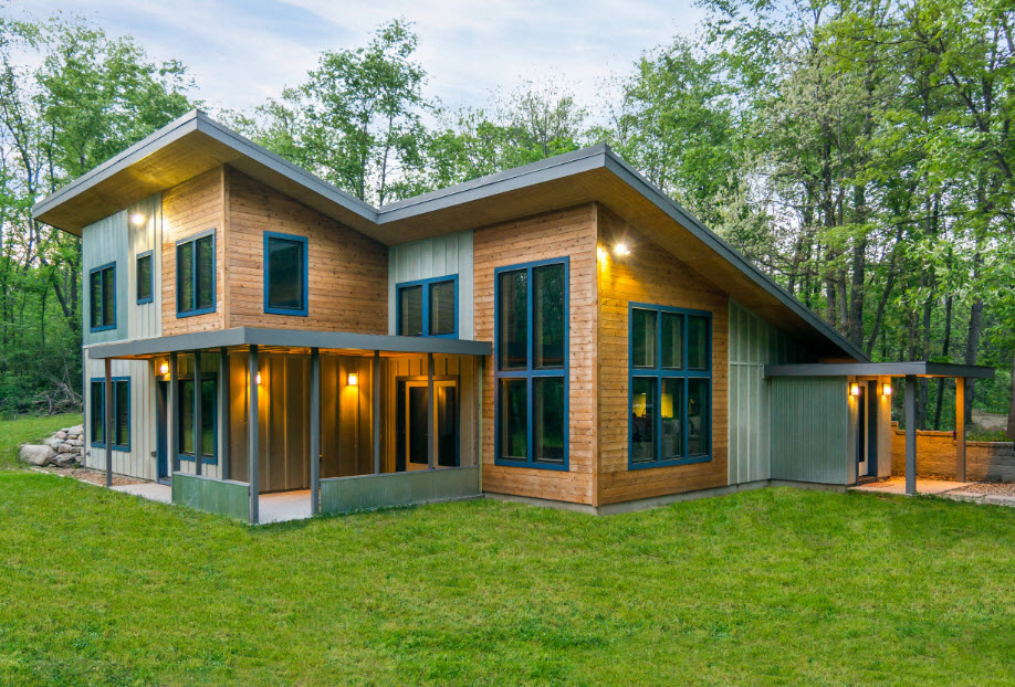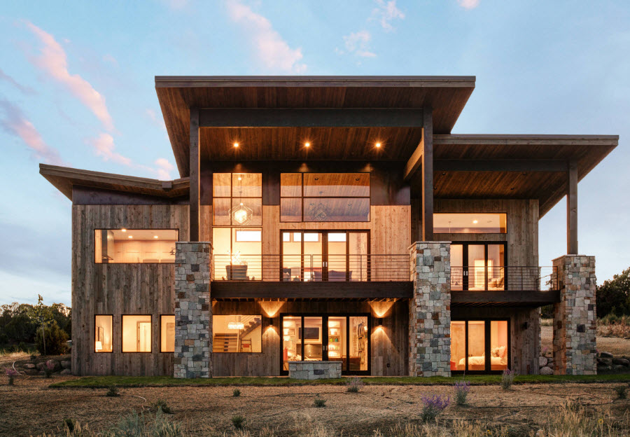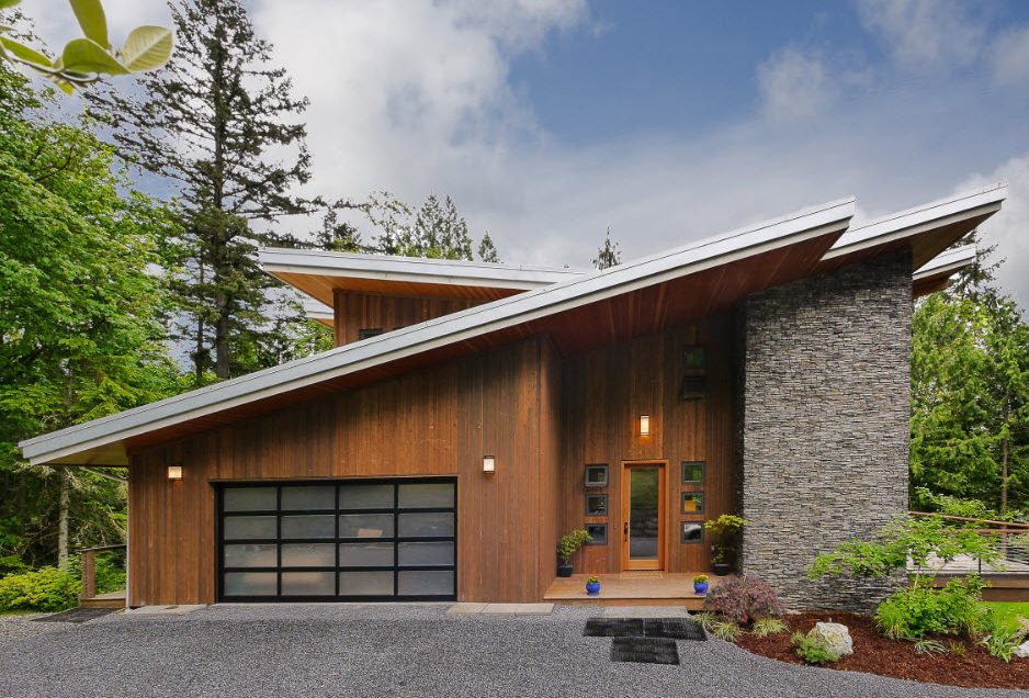 Wood cladding is organic not only in rural façade design. Imitation of glued beam in the decoration of laconic hi-tech forms looks original and spectacular.