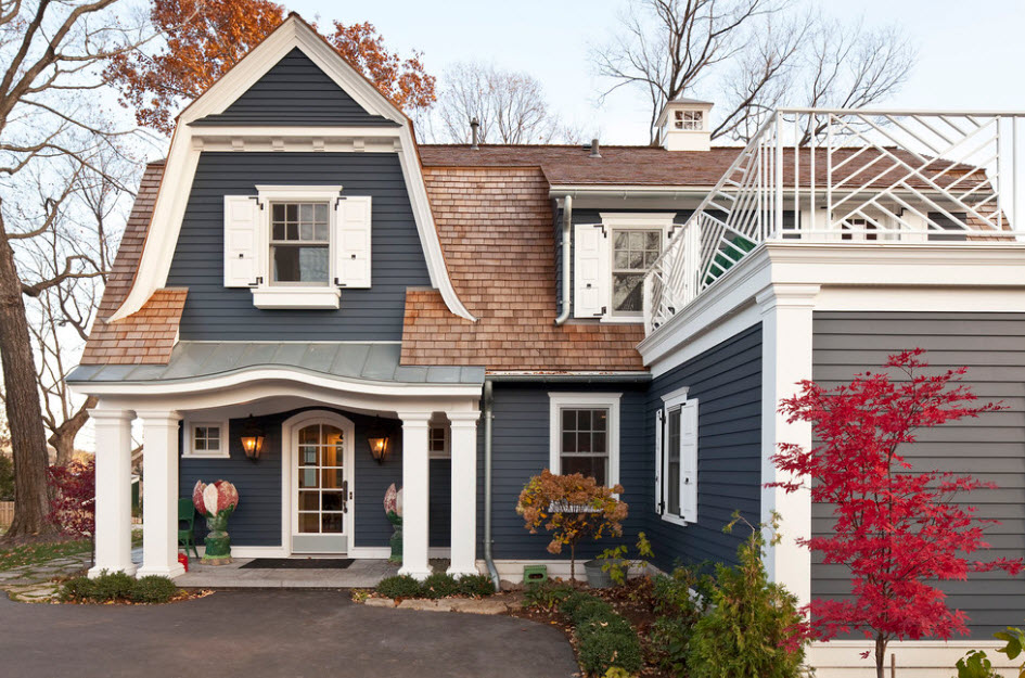 The classic way to decorate the facade is landscaping. Pastoral flower boxes or flowerpots hung from window sills, or climbing roses, grapes and ivy, wrapped around columns or crawling along walls and shading windows, will become a romantic and cozy design element. The contrast of carved greenery and stone or brickwork, delicate and bright petals on a background of gray stucco will help create a unique mood for the whole house. This technique is appropriate in classic and rustic design styles.