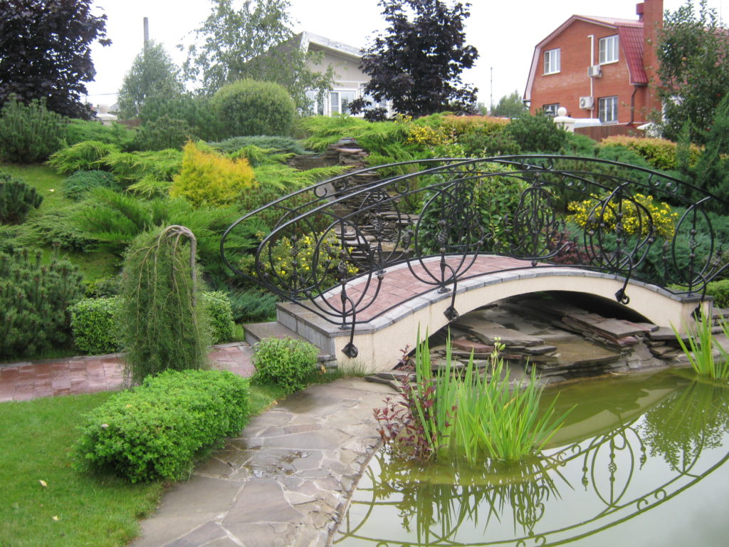Flowers for flower beds should be calm tones. It is preferable to take from light, such as milk, light brown and pale red, to dark (turquoise, burgundy and purple). Landscaping, as well as interior design, requires emphasis. There may be several. For example, in the afternoon it is a pond with a bridge, a fountain or an alpine hill with boulders and a brook. At night, due to the lighting, another object can be accented, although the alpine mountain is beautiful, whatever one may say, it can also be illuminated at night. Special lights installed under water will look especially beautiful.