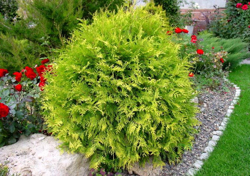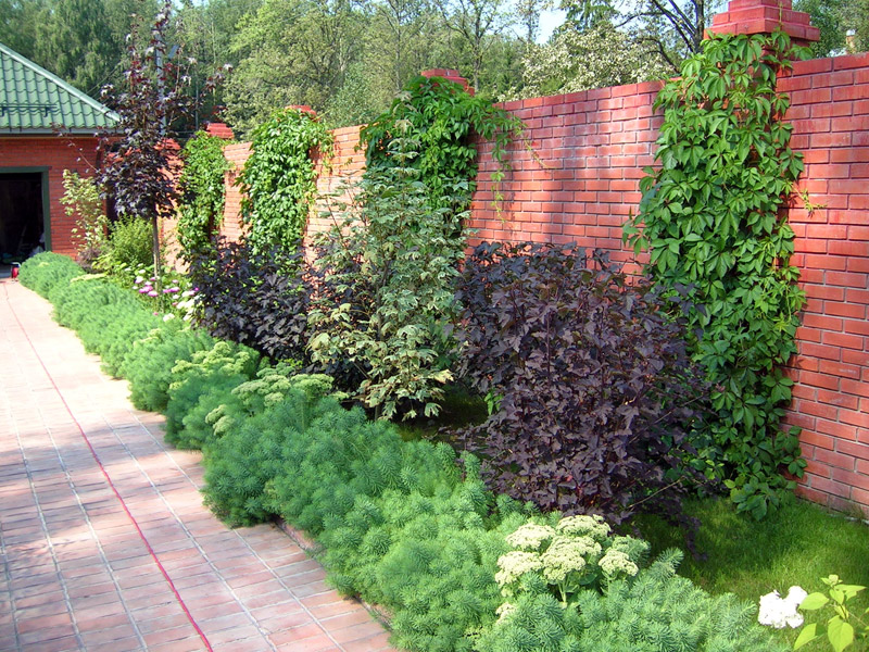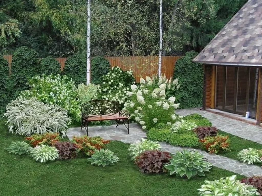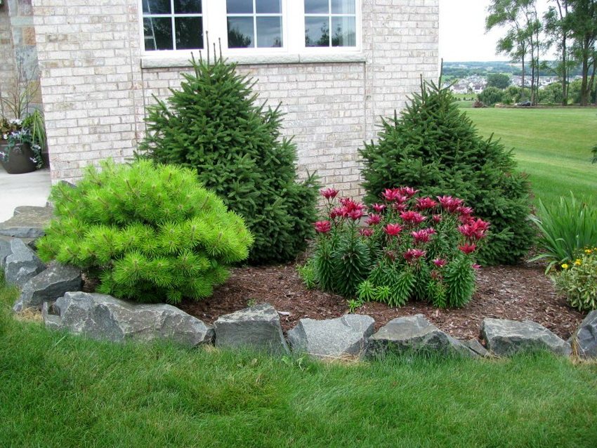 The central zone in front of the house is equipped with flower beds. A thematic composition is also possible with the use of decorative mills, small bridges and all kinds of paths, strewn with the help of multi-colored stones.