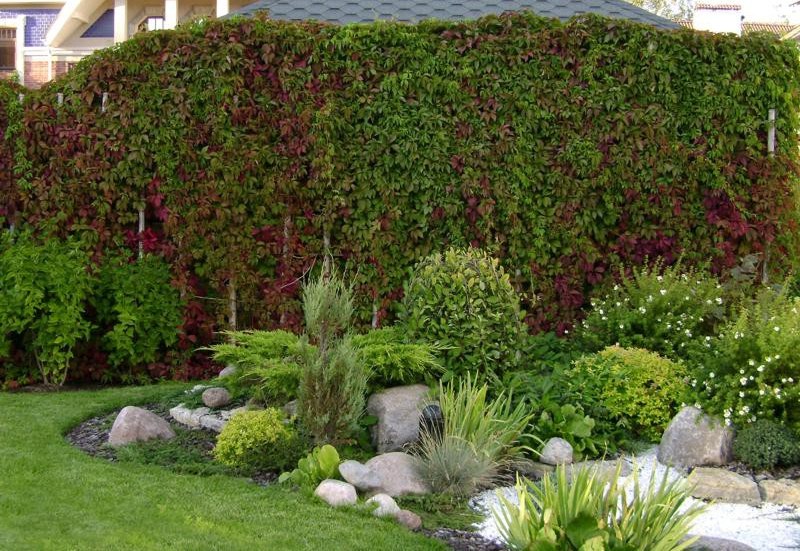 For this, girl’s grapes are used, which has dense and dense foliage, as well as various color schemes. Varieties of climbing plants are selected depending on the place of growth, and the required planting area.For example, choosing flowering plants for the facade of a house is not very prudent, and vice versa, planting non-flowering girl's grapes near a small tree. Here the choice is made according to the following principle: for a small area, blooming looms are used, and for large areas (to fill pergolas or trellises) - not blooming.