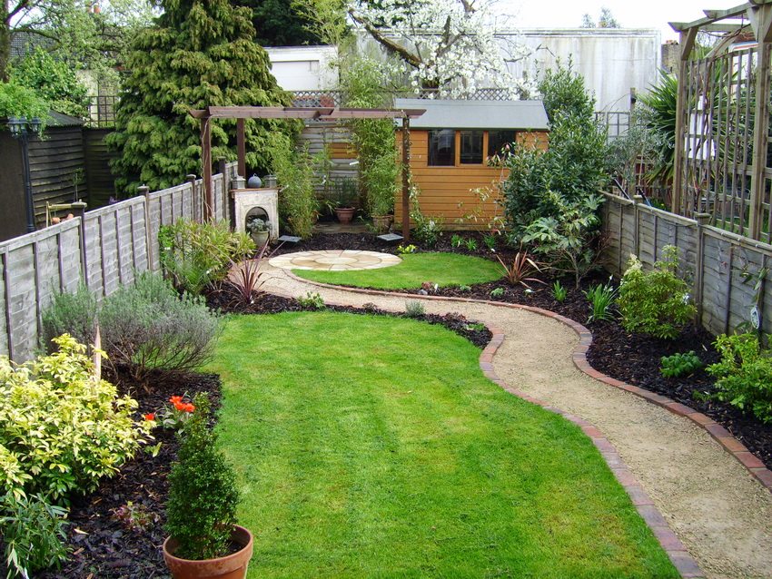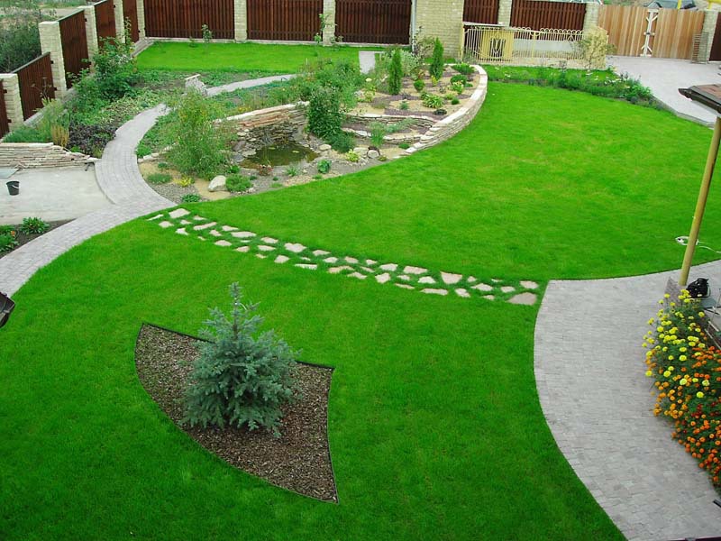 At the last stage of landscape planning, it remains to sow the seeds of lawn grass on the remaining land, or to purchase ready-made carpets. You can also fill up these “bald patches” with rubble, but this option is not practical due to the strong heating of the fraction from sunlight. Where it is better to go barefoot on a green and soft lawn.