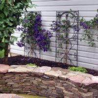 An interesting option would be to use volumetric flower beds in various forms. It can be a watch dial decorated with a floral arrangement, or a silhouette of a young girl whose hair is made of planted dahlias. Creation of small tubercles lined with stones with planting creeping flowers. Also, semicircular arches are made on the central flowerbeds, and a cascade of climbing roses or clematis blooming in blue is launched along them.