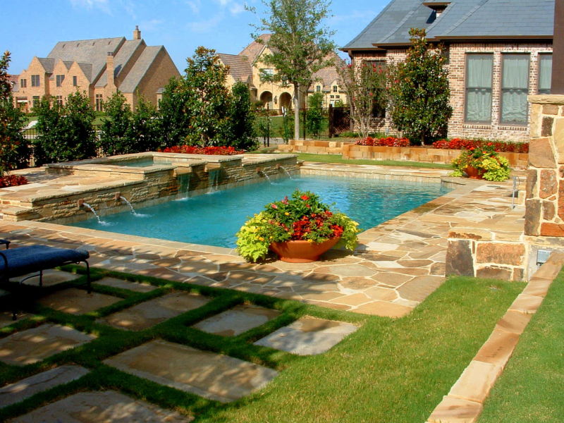 The pool, fountain or waterfall creates the desired freshness and coolness in the courtyard of a private house on hot summer days. The sound of falling water, the shadow of the garden, are relaxing.