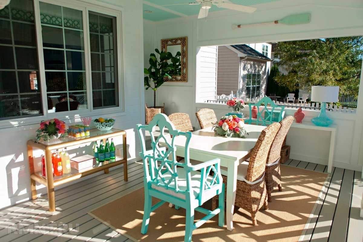 Choose based on the purpose of the veranda: you can create a small cozy place to relax, as well as a full dining room, hallway or living room. If you are not going to create a kitchen from the annexe, it’s enough to buy a designer table and light chairs so that you can sometimes chat over a cup of tea. You can cook kebab, then you need a barbecue.