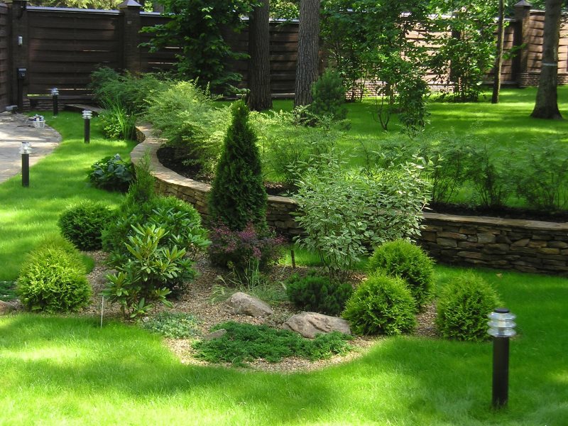 - Average - up to 10 acres. Such a size will allow the realization of bolder ideas on the south side. The design principle of the north is identical to the previous one. On 10 acres you can plant forest trees, make a Japanese garden, build a corner of wildlife with natural stones, unusual shrubs.